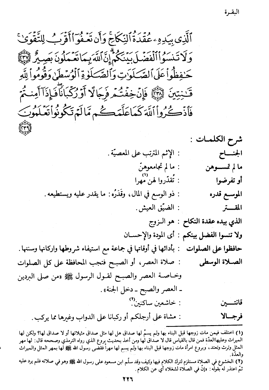الَّذِي بِيَدِهِ عُقْدَةُ النِّكَاحِ وَأَنْ تَعْفُوا أَقْرَبُ لِلتَّقْوَى وَلا تَنْسَوُا الْفَضْلَ بَيْنَكُمْ إِنَّ اللهَ بِمَا تَعْمَلُونَ بَصِيرٌ (237) حَافِظُوا عَلَى الصَّلَوَاتِ وَالصَّلاةِ الْوُسْطَى وَقُومُوا لِلَّهِ قَانِتِينَ (238) فَإِنْ خِفْتُمْ فَرِجَالاً أَوْ رُكْبَاناً فَإِذَا أَمِنْتُمْ فَاذْكُرُوا اللهَ كَمَا عَلَّمَكُمْ مَا لَمْ تَكُونُوا تَعْلَمُونَ (239) }