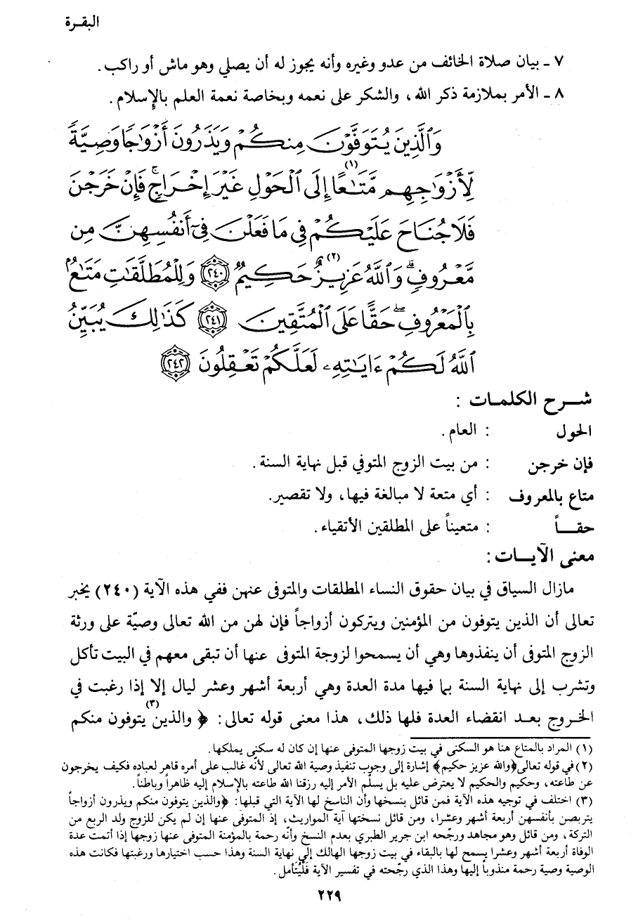 {وَالَّذِينَ يُتَوَفَّوْنَ مِنْكُمْ وَيَذَرُونَ أَزْوَاجاً وَصِيَّةً لأَزْوَاجِهِمْ مَتَاعاً1 إِلَى الْحَوْلِ غَيْرَ إِخْرَاجٍ فَإِنْ خَرَجْنَ فَلا جُنَاحَ عَلَيْكُمْ فِي مَا فَعَلْنَ فِي أَنْفُسِهِنَّ مِنْ مَعْرُوفٍ وَاللهُ عَزِيزٌ2حَكِيمٌ (240) وَلِلْمُطَلَّقَاتِ مَتَاعٌ بِالْمَعْرُوفِ حَقّاً عَلَى الْمُتَّقِينَ (241) كَذَلِكَ يُبَيِّنُ اللهُ لَكُمْ آيَاتِهِ لَعَلَّكُمْ تَعْقِلُونَ (242) }