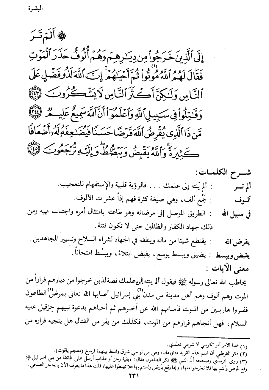 {أَلَمْ تَرَ إِلَى الَّذِينَ خَرَجُوا مِنْ دِيَارِهِمْ وَهُمْ أُلُوفٌ حَذَرَ الْمَوْتِ فَقَالَ لَهُمُ اللهُ مُوتُوا1 ثُمَّ أَحْيَاهُمْ إِنَّ اللهَ لَذُو فَضْلٍ عَلَى النَّاسِ وَلَكِنَّ أَكْثَرَ النَّاسِ لا يَشْكُرُونَ (243) وَقَاتِلُوا فِي سَبِيلِ اللهِ وَاعْلَمُوا أَنَّ اللهَ سَمِيعٌ عَلِيمٌ (244) مَنْ ذَا الَّذِي يُقْرِضُ اللهَ قَرْضاً حَسَناً فَيُضَاعِفَهُ لَهُ أَضْعَافاً كَثِيرَةً وَاللهُ يَقْبِضُ وَيَبْسُطُ وَإِلَيْهِ تُرْجَعُونَ (245) }
