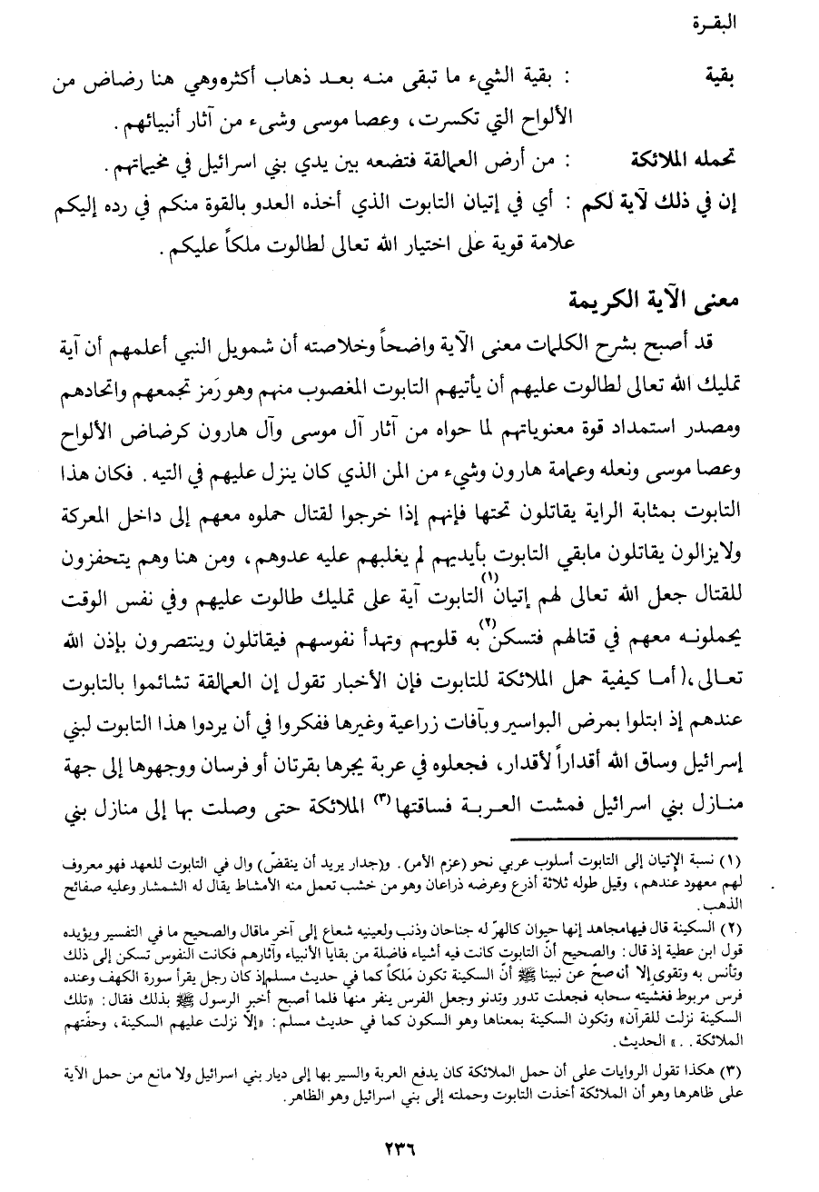 3 هكذا تقول الروايات على أن حمل الملائكة كان يدفع العربة والسير بها إلى ديار بني إسرائيل ولا مانع من حمل الآية على ظاهرها وهو أن الملائكة أخذت التابوت وحملته إلى بني إسرائيل وهو الظاهر.