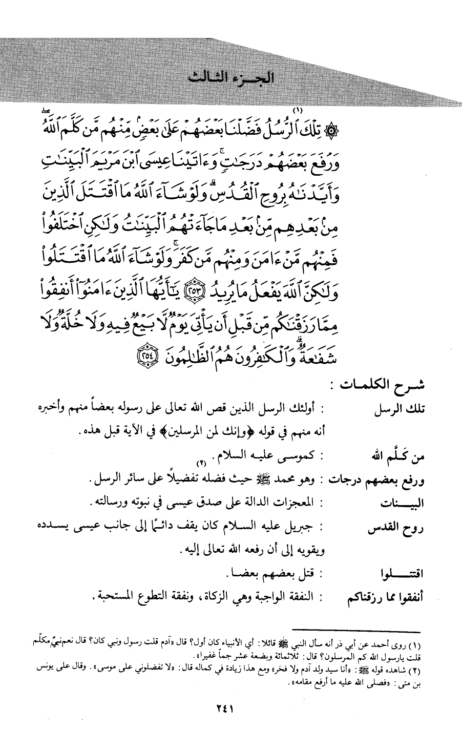 {تِلْكَ الرُّسُلُ1 فَضَّلْنَا بَعْضَهُمْ عَلَى بَعْضٍ مِنْهُمْ مَنْ كَلَّمَ اللهُ وَرَفَعَ بَعْضَهُمْ دَرَجَاتٍ وَآتَيْنَا عِيسَى ابْنَ مَرْيَمَ الْبَيِّنَاتِ وَأَيَّدْنَاهُ بِرُوحِ الْقُدُسِ وَلَوْ شَاءَ اللهُ مَا اقْتَتَلَ الَّذِينَ مِنْ بَعْدِهِمْ مِنْ بَعْدِ مَا جَاءَتْهُمُ الْبَيِّنَاتُ وَلَكِنِ اخْتَلَفُوا فَمِنْهُمْ مَنْ آمَنَ وَمِنْهُمْ مَنْ كَفَرَ وَلَوْ شَاءَ اللهُ مَا اقْتَتَلُوا وَلَكِنَّ اللهَ يَفْعَلُ مَا يُرِيدُ (253) يَا أَيُّهَا الَّذِينَ آمَنُوا أَنْفِقُوا مِمَّا رَزَقْنَاكُمْ مِنْ قَبْلِ أَنْ يَأْتِيَ يَوْمٌ لا بَيْعٌ فِيهِ وَلا خُلَّةٌ وَلا شَفَاعَةٌ وَالْكَافِرُونَ هُمُ الظَّالِمُونَ (254) }