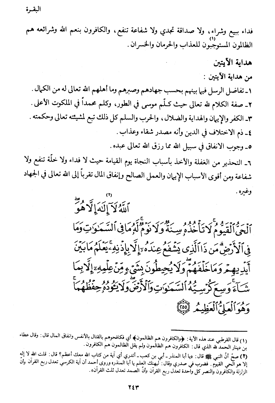 {اللهُ لا 2إِلَهَ إِلا هُوَ الْحَيُّ الْقَيُّومُ لا تَأْخُذُهُ سِنَةٌ وَلا نَوْمٌ لَهُ مَا فِي السَّمَاوَاتِ وَمَا فِي الأَرْضِ مَنْ ذَا الَّذِي يَشْفَعُ عِنْدَهُ إِلا بِإِذْنِهِ يَعْلَمُ مَا بَيْنَ أَيْدِيهِمْ وَمَا خَلْفَهُمْ وَلا يُحِيطُونَ بِشَيْءٍ مِنْ عِلْمِهِ إِلا بِمَا شَاءَ وَسِعَ كُرْسِيُّهُ السَّمَاوَاتِ وَالأَرْضَ وَلا يَؤُودُهُ حِفْظُهُمَا وَهُوَ الْعَلِيُّ الْعَظِيمُ (255) }