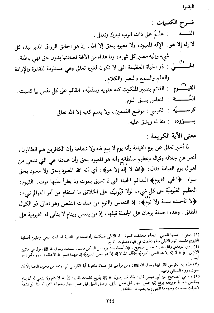 1 الحي: أصلها الحيي؛ كالحذر فحذفت كسرة الياء الأولى فسكنت وأدغمت في الثانية فصارت الحي، والقيوم أصلها القيووم، فقلبت الواو الأولى ياء وأدغمت في الياء فصارت القيوم.