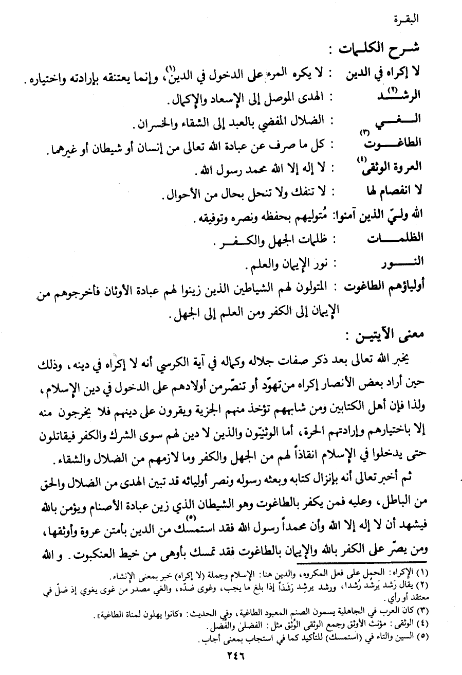 ثم أخبر تعالى أنه بإنزال كتابه وبعثه رسوله ونصر أولياءه قد تبين الهدى من الضلال والحق من الباطل، وعليه فمن يكفر بالطاغوت وهو الشيطان الذي زين عبادة الأصنام ويؤمن بالله فيشهد أن لا إله إلا الله وأن محمداً رسول الله فقد استمسك5 من الدين بأمتن عروة وأوثقها، ومن يصر على الكفر بالله والإيمان بالطاغوت فقد تمسك بأوهى من خيط العنكبوت. والله