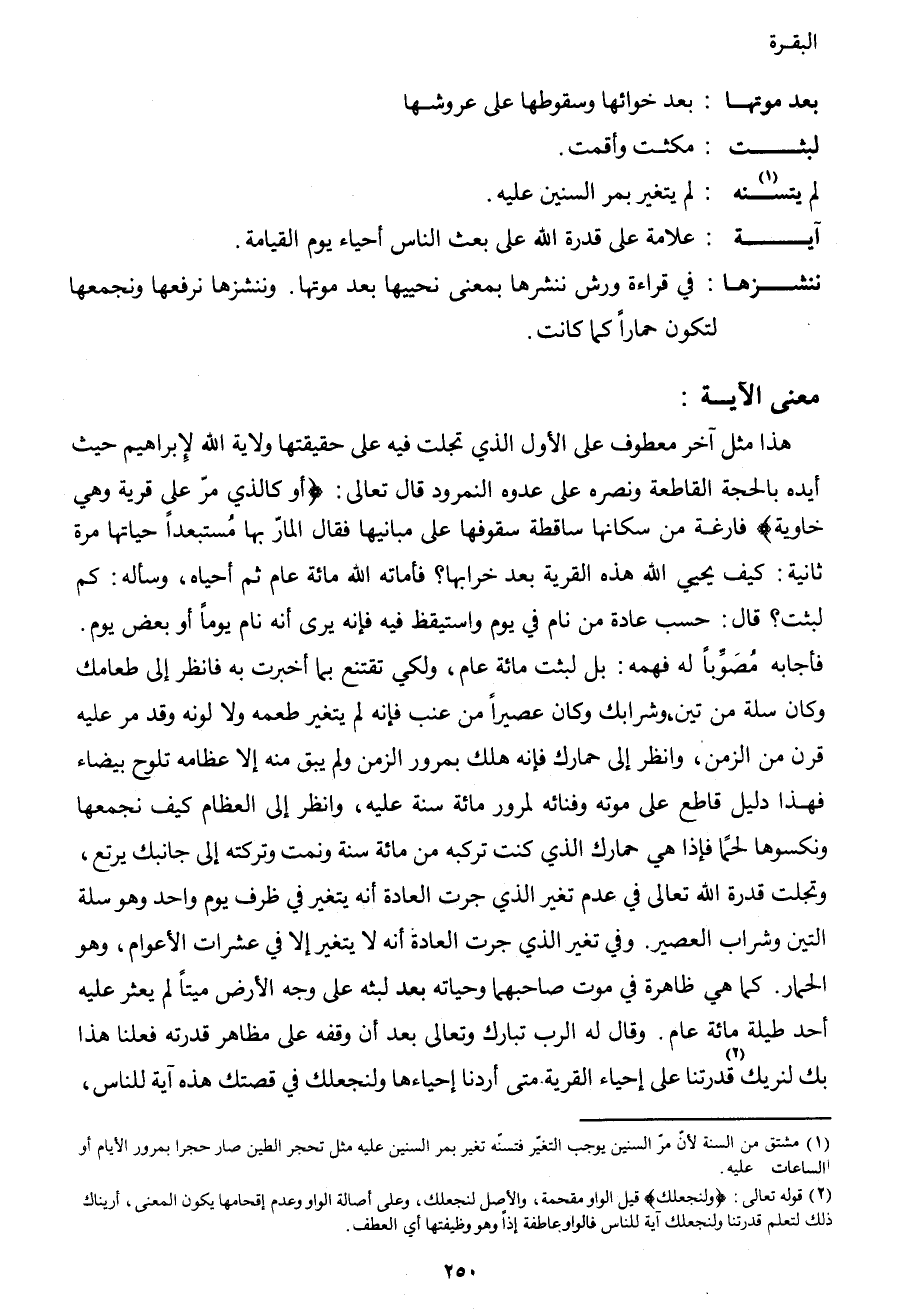 هذا مثل آخر معطوف على الأول الذي تجلت فيه على حقيقتها ولاية الله لإبراهيم حيث أيده بالحجة القاطعة ونصره على عدوه النمرود، قال تعالى: {أَوْ كَالَّذِي مَرَّ عَلَى قَرْيَةٍ وَهِيَ خَاوِيَةٌ} فارغة من سكانها ساقطة سقوفها على مبانيها فقال المار بها مستبعداً حياتها مرة ثانية: كيف يحيي الله هذه القرية بعد خرابها؟ فأماته الله مائة عام ثم أحياه، وسأله: كم لبتث؟ قال: حسب عادة من نام في يوم واستيقظ فيه، فإنه يرى أنه نام يوماً أو بعض يوم، فأجابه مصوباً له فهمه: {بَلْ لَبِثْتَ مِائَةَ عَامٍ} ، ولكي تقتنع بما أخبرت به، فانظر إلى طعامك وكان سلة من تين وشرابك وكان عصيراً من عنب فإنه لم يتغير طعمه ولا لونه، وقد مر عليه قرن من الزمن، وانظر إلى حمارك فإنه هلك بمرور الزمن ولم يبقى منه إلا عظامه تلوح بيضاء فهذا دليل قاطع على موته وفناؤه لمرور مائة سنة عليه، وانظر إلى العظام كيف نجمعها ونكسوها لحماً فإذا هي حمارك الذي كنت تركبه من مائة سنة، ونمت وتركته إلى جانبك يرتع، وتجلت قدرة الله تعالى في عدم تغير الذي جرت العادة أنه يتغير في ظرف يوم واحد، وهو سلة التين وشراب العصير. وفي تغير الذي جرت العادة أنه لا يتغير إلا في عشرات الأعوام، وهو الحمار. كما هي ظاهرة في موت صاحبهما وحياته بعد لبثه على وجه الأرض ميتاً لم يعثر عليه أحد طيلة مائة عام. وقال له الرب تبارك وتعالى بعد أن وقفه على مظاهر قدرته فعلنا هذا بك لنريك2 قدرتنا على إحياء القرية متى أردنا إحياءها ولنجعلك في قصتك هذه آية للناس،