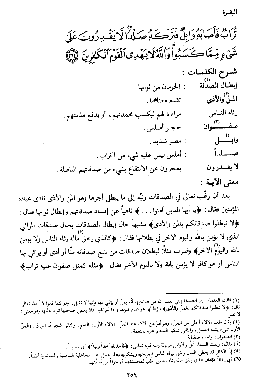 بعد أن رغب تعالى في الصدقات ونبه إلى ما يبطل أحرها وهو المن والأذى نادى عباده المؤمنين فقال: {يَا أَيُّهَا الَّذِينَ آمَنُوا ... } ناهياً عن إفساد صدقاتهم وإبطال ثوابها فقال: {لا تُبْطِلُوا صَدَقَاتِكُمْ بِالْمَنِّ وَالأَذَى} مشبهاً حال إبطال الصدقات بحال صدقات المرائي الذي لا يؤمن بالله واليوم الآخر في بطلانها فقال: {وَالأَذَى كَالَّذِي يُنْفِقُ5 مَالَهُ رِئَاءَ النَّاسِ وَلا يُؤْمِنُ بِاللهِ وَالْيَوْمِ6 الآخِرِ} وضرب مثلاً لبطلان صدقات من يتبع صدقاته مناً أو أذى أو يرائي بها الناس أو هو كافر لا يؤمن بالله ولا باليوم الآخر فقال: {فَمَثَلُهُ كَمَثَلِ صَفْوَانٍ عَلَيْهِ تُرَابٌ}