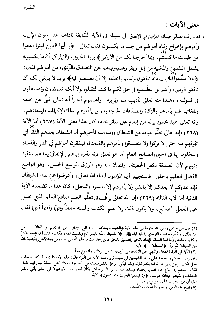 بعدما رغب تعالى عباده المؤمنين في الإنفاق في سبيله في الآية السابقة ناداهم هنا بعنوان الإيمان، وأمرهم بإخراج زكاة أموالهم من جيد ما يكسبون فقال تعالى: {يَا أَيُّهَا الَّذِينَ1 آمَنُوا أَنْفِقُوا مِنْ طَيِّبَاتِ مَا كَسَبْتُمْ2 وَمِمَّا أَخْرَجْنَا} يريد الحبوب والثمار كما أن ما يكسبونه يشمل النقدين والماشية من إبل وبقر وغنم، ونهاهم عن التصدق بالرديء من أموالهم، فقال: {وَلا تَيَمَّمُوا3 الْخَبِيثَ مِنْه4ُ تُنْفِقُونَ وَلَسْتُمْ بِآخِذِيهِ إِلا أَنْ تُغْمِضُوا فِيهِ} يريد لا ينبغي لكم أن تنفقوا الرديء وأنتم لو أعطيتموه في حق لكم ما كنتم لتقبلوه لولا أنكم تغمضون وتتساهلون في قبوله، وهذا منه تعالى تأديب لهم وتربية. وأعلمهم أخيراً أنه تعالى غني عن خلقه ونفقاتهم فلم يأمرهم بالزكاة والصدقات لحاجة به، وإنما أمرهم بذلك لإكمالهم وإسعادهم، وأنه تعالى حميد محمود بماله من إنعام على سائر خلقه، كان هذا معنى الآية (267) أما الآية (268) فإنه تعالى يحذر عباده من الشيطان ووسواسه فأخبرهم أن الشيطان يعدهم الفقر5، أي: يخوفهم منه حتى لا يزكوا ولا يتصدقوا ويأمرهم بالفحشاء فينفقون أموالهم في الشر والفساد ويبخلون بها في الخير، والصالح العام، أما هو تعالى فإنه بأمره إياهم بالإنفاق يعدهم مغفرة ذنوبهم؛ لأن الصدقة تكفر الخطيئة، وفضلاً منه وهو الرزق الواسع الحسن، وهو الواسع الفضل العليم بالخلق. فاستجيبوا أيها المؤمنون لنداء الله تعالى، وأعرضوا عن نداء الشيطان فإنه عدوكم لا يعدكم إلا بالشر، يأمركم إلا بالسوء والباطل، كان هذا ما تضمنته الآية الثانية، أما الآية الثالثة (269) فإن الله تعالى يرغب في تعلم العلم النافع الذي يحمل على العمل الصالح، ولا يكون ذلك إلا علم الكتاب والسنة حفظاً وفهماً وفقهاً فيهما فقال