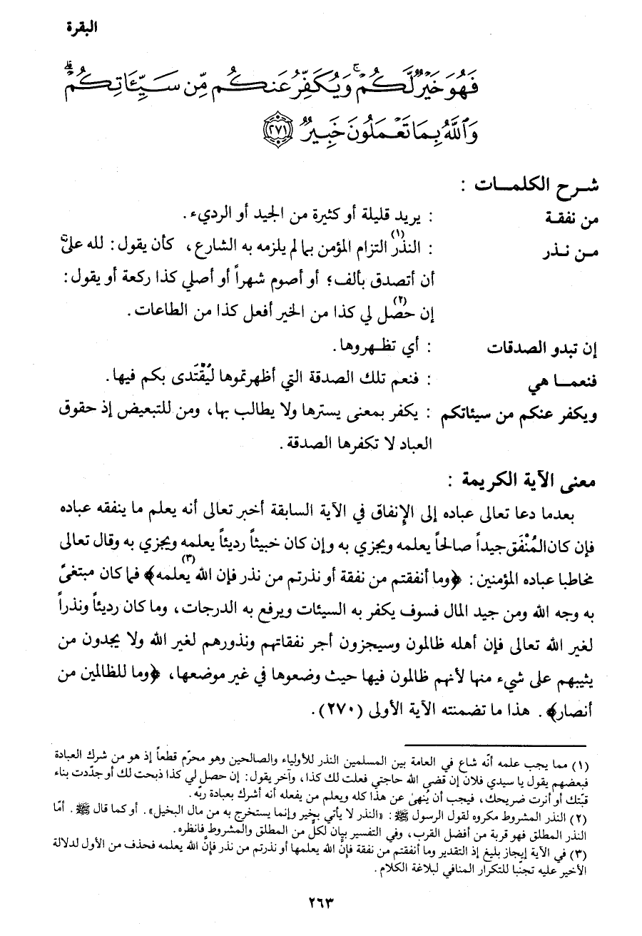 بعدما دعا تعالى عباده إلى الإنفاق في الآية السابقة أخبر تعالى أنه يعلم ما ينفقه عباده فإن كان المنفق جيداً صالحاً يعلمه ويجزي به وإن كان خبيثاً رديئاً يعلمه ويجزي به، وقال تعالى مخاطباً عباده المؤمنين: {وَمَا أَنْفَقْتُمْ مِنْ نَفَقَةٍ أَوْ نَذَرْتُمْ مِنْ نَذْرٍ فَإِنَّ اللهَ يَعْلَمُهُ3} فما كان مبتغي به وجه الله ومن جيد المال فسوف يكفر به السيئات ويرفع به الدرجات، وما كان رديئاً ونذراً لغير الله تعالى فإن أهله ظالمون وسيغرمون أجر نفقاتهم ونذرهم لغير الله ولا يجدون من يثيبهم على شيء منها لأنهم ظالمون فيها حيث وضعوها في غير موضعها، {وَمَا لِلظَّالِمِينَ مِنْ أَنْصَارٍ} هذا ما تضمنته الآية الأولى (270) .