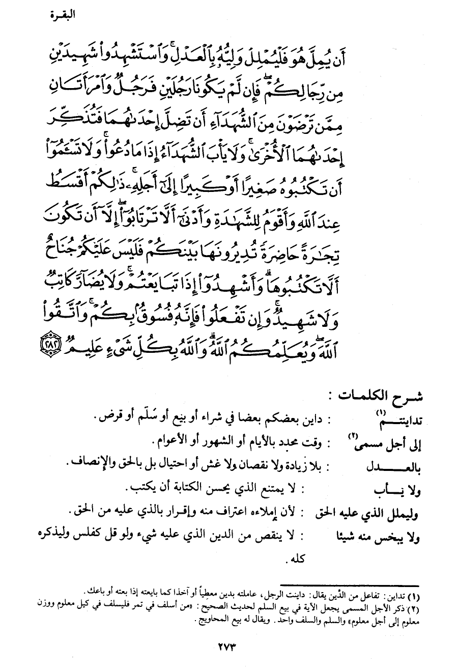 أَنْ يُمِلَّ هُوَ فَلْيُمْلِلْ وَلِيُّهُ بِالْعَدْلِ وَاسْتَشْهِدُوا شَهِيدَيْنِ مِنْ رِجَالِكُمْ فَإِنْ لَمْ يَكُونَا رَجُلَيْنِ فَرَجُلٌ وَامْرَأَتَانِ مِمَّنْ تَرْضَوْنَ مِنَ الشُّهَدَاءِ أَنْ تَضِلَّ إِحْدَاهُمَا فَتُذَكِّرَ إِحْدَاهُمَا الأُخْرَى وَلا يَأْبَ الشُّهَدَاءُ إِذَا مَا دُعُوا وَلا تَسْأَمُوا أَنْ تَكْتُبُوهُ صَغِيراً أَوْ كَبِيراً إِلَى أَجَلِهِ ذَلِكُمْ أَقْسَطُ عِنْدَ اللهِ وَأَقْوَمُ لِلشَّهَادَةِ وَأَدْنَى أَلا تَرْتَابُوا إِلا أَنْ تَكُونَ تِجَارَةً حَاضِرَةَ تُدِيرُونَهَا بَيْنَكُمْ فَلَيْسَ عَلَيْكُمْ جُنَاحٌ أَلا تَكْتُبُوهَا وَأَشْهِدُوا إِذَا تَبَايَعْتُمْ وَلا يُضَارَّ كَاتِبٌ وَلا شَهِيدٌ وَإِنْ تَفْعَلُوا فَإِنَّهُ فُسُوقٌ بِكُمْ وَاتَّقُوا اللهَ وَيُعَلِّمُكُمُ اللهُ وَاللهُ بِكُلِّ شَيْءٍ عَلِيمٌ (282) }