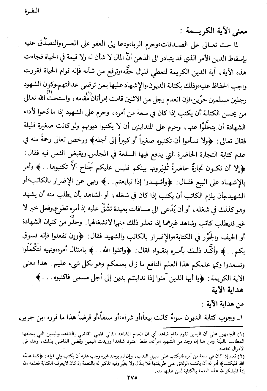 لما حث تعالى على الصدقات وحرم الربا، ودعا إلى العفو على المعسر، والتصدق عليه بإسقاط الدين الأمر الذي قد يتبادر إلى الذهن أن المال لا شأن له ولا قيمة في الحياة فجاءت هذه الآية، آية الدين الكريمة لتعطي للمال حقه وترفع من شأنه فإنه قوام الحياة فقررت واجب الحفاظ عليه بكتابة الديون والإشهاد عليها بمن ترضى عدالتهم وكون الشهود رجلين مسلمين حرين، فإن انعدام رجل من الاثنين قامت امرأتان1 مقامه، واستحث2 الله تعالى من يحسن الكتابة أن يكتب إذا كان في سعة من أمره، وحرم على الشهود إذا ما دعوا لأداء الشهادة أن يتخلوا عنها، وحرم على المتداينين أن لا يكتبوا ديونهم ولو كانت صغيرة قليلة، فقال تعالى: {وَلا تَسْأَمُوا أَنْ تَكْتُبُوهُ صَغِيراً أَوْ كَبِيراً إِلَى أَجَلِهِ} ، ورخص تعالى رحمة منه في عدم كتابة التجارة الحاضرة التي يدفع فيها السلعة في المجلس ويقبض الثمن فيه فقال: {إِلا أَنْ تَكُونَ تِجَارَةً حَاضِرَةَ تُدِيرُونَهَا بَيْنَكُمْ فَلَيْسَ عَلَيْكُمْ جُنَاحٌ أَلا تَكْتُبُوهَا ... } ، وأمر بالإشهاد على البيع فقال: {وَأَشْهِدُوا إِذَا تَبَايَعْتُمْ ... } ، ونهى عن الإضرار بالكاتب أو الشهيدين، بأن يلزم الكاتب أن يكتب إذا كان في شغله، أو الشاهد بأن يطلب منه أن يشهد وهو كذلك في شغله، أو أن يدعي إلى مسافات بعيدة تشق عليه إذ أمره تطوع وفعل خير لا غير فليطلب كاتب وشاهد غيرهما إذا تعذر ذلك منهما لانشغالهما. وحذر من كتمان الشهادة أو الحيف والجور في الكتابة والإضرار بالكاتب والشهيد فقال: {وَإِنْ تَفْعَلُوا فَإِنَّهُ فُسُوقٌ بِكُمْ ... } وأكد ذلك بأمره بتقواه فقال: {وَاتَّقُوا اللهَ ... } بامتثال أمره ونهيه لتكملوا وتسعدوا وكما علمكم هذا العلم النافع ما زال يعلمكم وهو بكل شيء عليم. هذا معنى الآية الكريمة: {يَا أَيُّهَا الَّذِينَ آمَنُوا إِذَا تَدَايَنْتُمْ بِدَيْنٍ إِلَى أَجَلٍ مُسَمّىً فَاكْتُبُوهُ ... } .