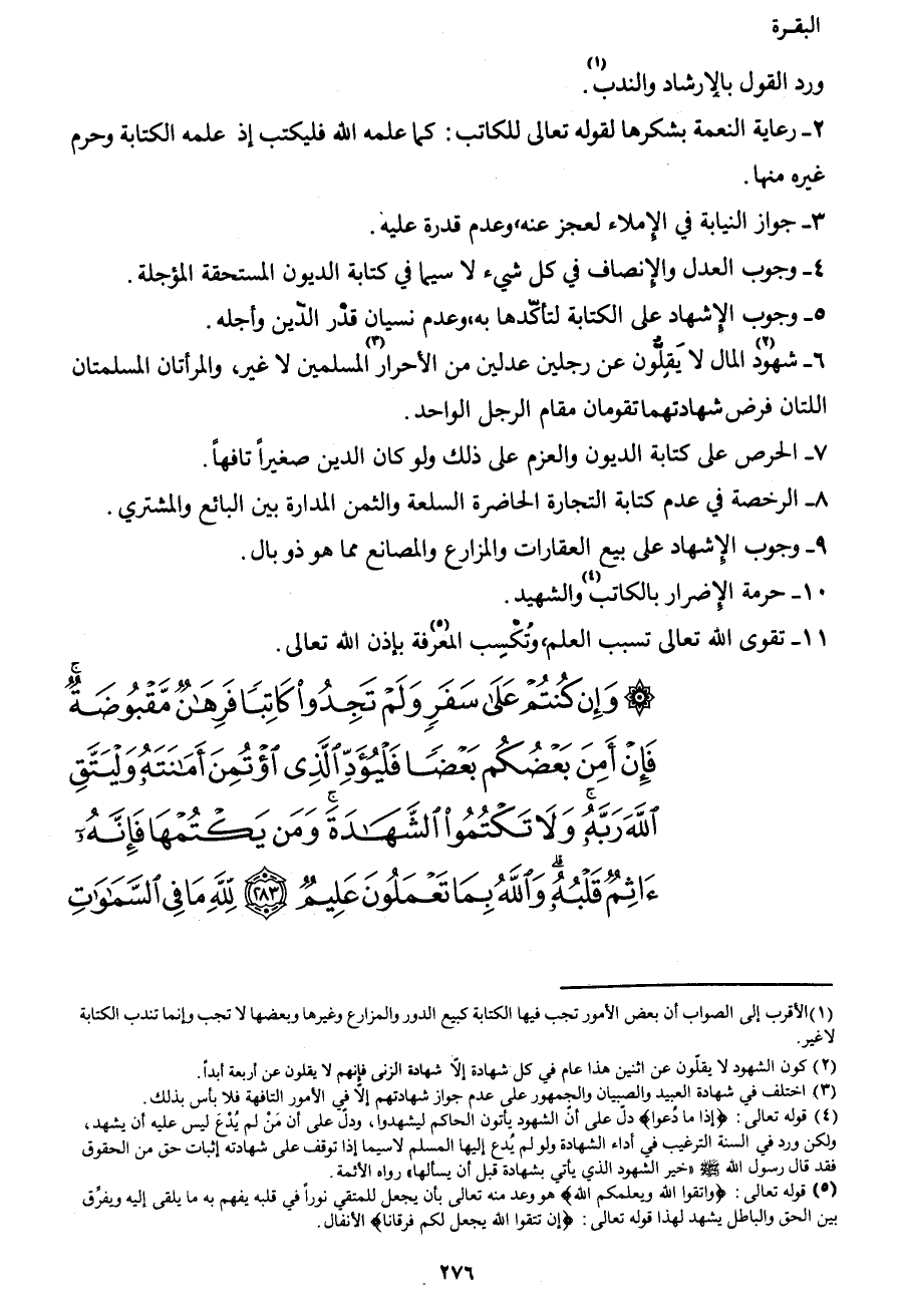 {وَإِنْ كُنْتُمْ عَلَى سَفَرٍ وَلَمْ تَجِدُوا كَاتِباً فَرِهَانٌ مَقْبُوضَةٌ فَإِنْ أَمِنَ بَعْضُكُمْ بَعْضاً فَلْيُؤَدِّ الَّذِي اؤْتُمِنَ أَمَانَتَهُ وَلْيَتَّقِ اللهَ رَبَّهُ وَلا تَكْتُمُوا الشَّهَادَةَ وَمَنْ يَكْتُمْهَا فَإِنَّهُ آثِمٌ قَلْبُهُ وَاللهُ بِمَا تَعْمَلُونَ عَلِيمٌ (283) لِلَّهِ مَا فِي السَّمَاوَاتِ