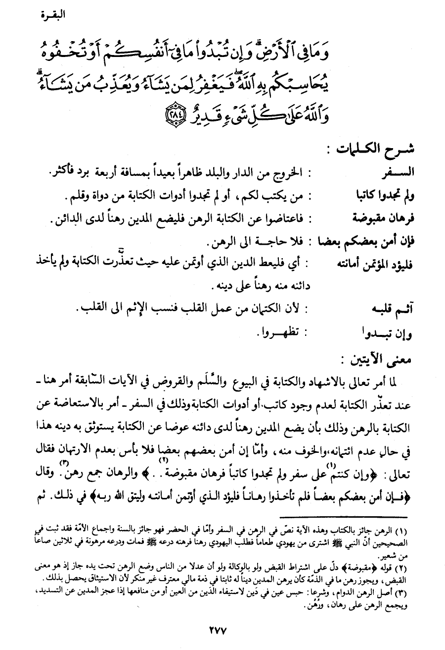 لما أمر تعالى بالإشهاد والكتابة في البيوع والسلم والفروض في الآيات السابقة أمر هنا –عند تعذر الكتابة لعدم وجود كاتب أو أدوات الكتابة وذلك في السفر- أمر بالاستعاضة عن الكتابة بالرهن وذلك بأن يضع المدين رهناً لدى دائنه عوضاً عن الكتابة يستوثق به دينه هذا في حال عدم ائتمانه والخوف منه، وأما إن أمن بعضهم بعضاً فلا باس بعدم الارتهان فقال تعال: {وَإِنْ كُنْتُمْ1 عَلَى سَفَرٍ وَلَمْ تَجِدُوا كَاتِباً فَرِهَانٌ مَقْبُوضَةٌ2 ... } والرهان جمع رهن3. وقال: {فَإِنْ أَمِنَ بَعْضُكُمْ بَعْضاً} فلم تأخذوا رهاناً، {فَلْيُؤَدِّ الَّذِي اؤْتُمِنَ أَمَانَتَهُ وَلْيَتَّقِ اللهَ رَبَّهُ} في ذلك. ثم