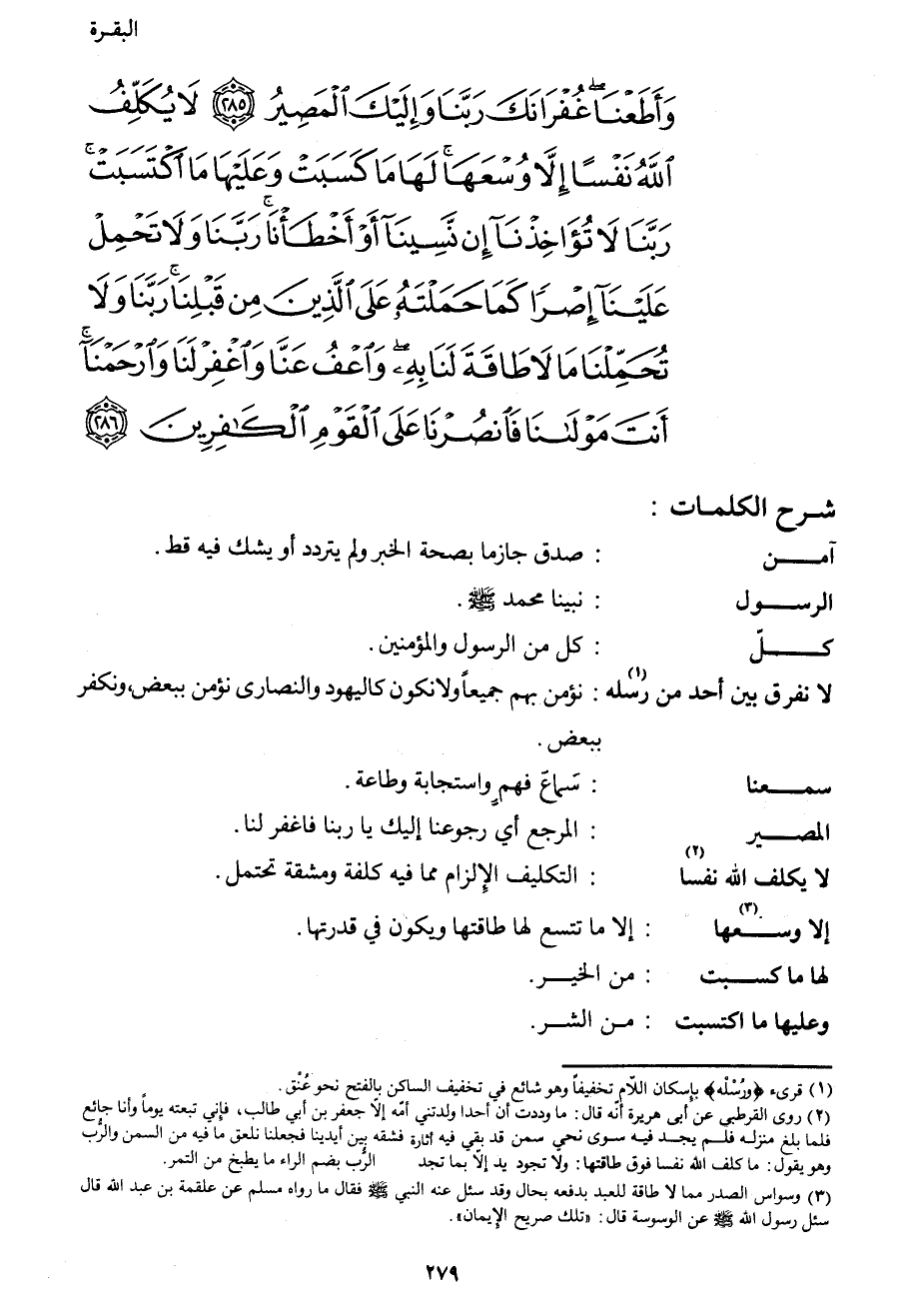 وَأَطَعْنَا غُفْرَانَكَ رَبَّنَا وَإِلَيْكَ الْمَصِيرُ (285) لا يُكَلِّفُ اللهُ نَفْساً إِلا وُسْعَهَا لَهَا مَا كَسَبَتْ وَعَلَيْهَا مَا اكْتَسَبَتْ رَبَّنَا لا تُؤَاخِذْنَا إِنْ نَسِينَا أَوْ أَخْطَأْنَا رَبَّنَا وَلا تَحْمِلْ عَلَيْنَا إِصْراً كَمَا حَمَلْتَهُ عَلَى الَّذِينَ مِنْ قَبْلِنَا رَبَّنَا وَلا تُحَمِّلْنَا مَا لا طَاقَةَ لَنَا بِهِ وَاعْفُ عَنَّا وَاغْفِرْ لَنَا وَارْحَمْنَا أَنْتَ مَوْلانَا فَانْصُرْنَا عَلَى الْقَوْمِ الْكَافِرِينَ (286) }