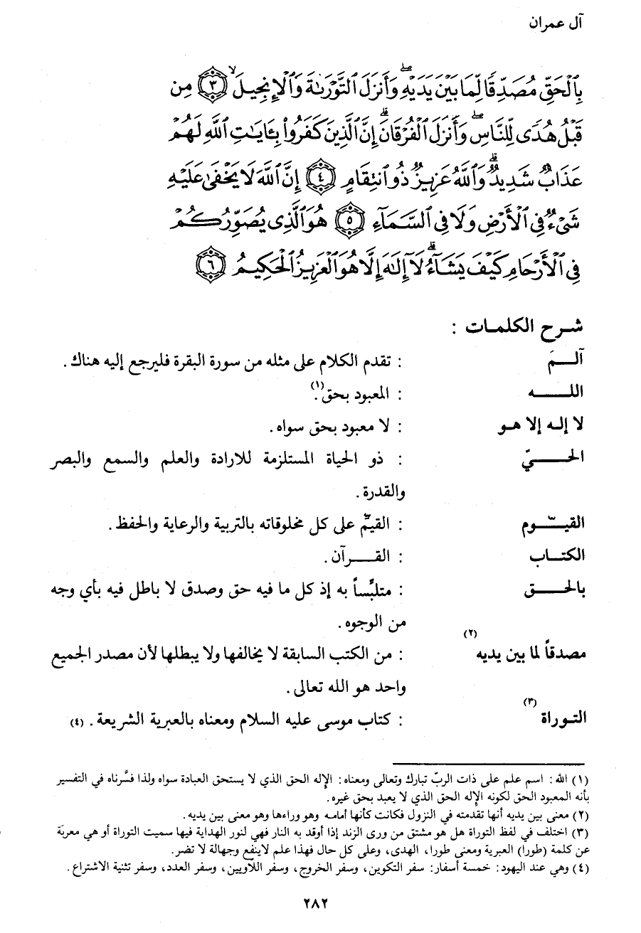 بِالْحَقِّ مُصَدِّقاً لِمَا بَيْنَ يَدَيْهِ وَأَنْزَلَ التَّوْرَاةَ والإنجيل (3) مِنْ قَبْلُ هُدىً لِلنَّاسِ وَأَنْزَلَ الْفُرْقَانَ إِنَّ الَّذِينَ كَفَرُوا بآيَاتِ اللهِ لَهُمْ عَذَابٌ شَدِيدٌ وَاللهُ عَزِيزٌ ذُو انْتِقَامٍ (4) إِنَّ اللهَ لا يَخْفَى عَلَيْهِ شَيْءٌ فِي الأَرْضِ وَلا فِي السَّمَاءِ (5) هُوَ الَّذِي يُصَوِّرُكُمْ فِي الأَرْحَامِ كَيْفَ يَشَاءُ لا إِلَهَ إِلا هُوَ الْعَزِيزُ الْحَكِيمُ (6) }