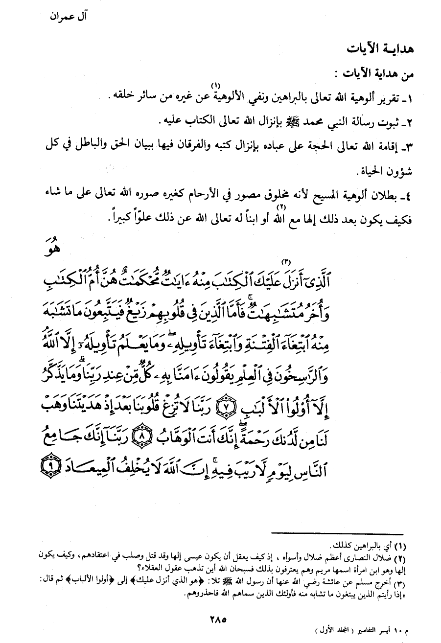 {هُوَ الَّذِي أَنْزَلَ3 عَلَيْكَ الْكِتَابَ مِنْهُ آيَاتٌ مُحْكَمَاتٌ هُنَّ أُمُّ الْكِتَابِ وَأُخَرُ مُتَشَابِهَاتٌ فَأَمَّا الَّذِينَ فِي قُلُوبِهِمْ زَيْغٌ فَيَتَّبِعُونَ مَا تَشَابَهَ مِنْهُ ابْتِغَاءَ الْفِتْنَةِ وَابْتِغَاءَ تَأْوِيلِهِ وَمَا يَعْلَمُ تَأْوِيلَهُ إِلا اللهُ وَالرَّاسِخُونَ فِي الْعِلْمِ يَقُولُونَ آمَنَّا بِهِ كُلٌّ مِنْ عِنْدِ رَبِّنَا وَمَا يَذَّكَّرُ إِلا أُولُو الأَلْبَابِ (7) رَبَّنَا لا تُزِغْ قُلُوبَنَا بَعْدَ إِذْ هَدَيْتَنَا وَهَبْ لَنَا مِنْ لَدُنْكَ رَحْمَةً إِنَّكَ أَنْتَ الْوَهَّابُ (8) رَبَّنَا إِنَّكَ جَامِعُ النَّاسِ لِيَوْمٍ لا رَيْبَ فِيهِ إِنَّ اللهَ لا يُخْلِفُ الْمِيعَادَ (9) }