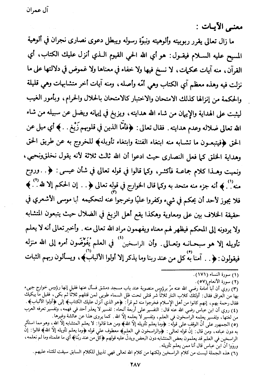 ما زال تعالى يقرر ربوبيته وألوهيته ونبوة رسوله ويبطل دعوى نصاري نجران في ألوهية المسيح عليه السلام، فيقول: هو أي: الله الحي القيوم الذي أنزل عليك الكتاب، أي: القرآن منه آيات محكمات، لا نسخ فيها ولا خفاء في معناها ولا غموض في دلالتها على ما نزلت فيه وهذه معظم آي الكتاب وهي أمة واصلة، ومنه آيات أخر متشابهات وهي قليلة والحكمة من إنزالها كذلك الامتحان والاختبار بالحلال والحرام، وبأمور الغيب ليثبت على الهداية والإيمان من شاء الله هدايته، ويزيغ في إيمانه وضل عن سبيله من شاء الله تعالى ضلاله وعدم هدايته. فقال تعالى: {فَأَمَّا الَّذِينَ فِي قُلُوبِهِمْ زَيْغٌ ... } أي: ميل عن الحق {فَيَتَّبِعُونَ مَا تَشَابَهَ مِنْهُ ابْتِغَاءَ الْفِتْنَةِ وَابْتِغَاءَ تَأْوِيلِهِ} للخروج به عن طريق الحق وهداية الخلق كما فعل النصارى حيث ادعوا أن الله ثالث ثلاثة؛ لأنه يقول نخلق ونحيي، ونميت، وهذا كلام جماعة فأكثر، وكما قالوا في قوله تعالى في شأن عيسى: { ... وَرُوحٌ مِنْهُ1 ... } أنه جزء منه متحد به وكما قال الخوارج في قوله تعالى: { ... إِنِ الْحُكْمُ إِلا لِلَّهِ2 ... } فلا يجوز لأحد أن يحكم في شيء وكفروا علياً وخرجوا3 عنه لتحكيمه أبا موسى الأشعري في حقيقة الخلاف بين على ومعاوية، وهكذا يقع أهل الزيغ في الضلال حيث يتبعون المتشابه ولا يردونه إلى المحكم فيظهر لهم معناه ويفهمون مراد الله تعالى منه. وأخبر تعالى أنه لا يعلم تأويله إلا هو سبحانه وتعالى، وأن الراسخين4 في العلم يفوضون أمره إلى الله منزله فيقولون { ... آمَنَّا بِهِ5 كُلٌّ مِنْ عِنْدِ رَبِّنَا وَمَا يَذَّكَّرُ إِلا أُولُو الأَلْبَاب6} ، ويسألون ربهم الثبات