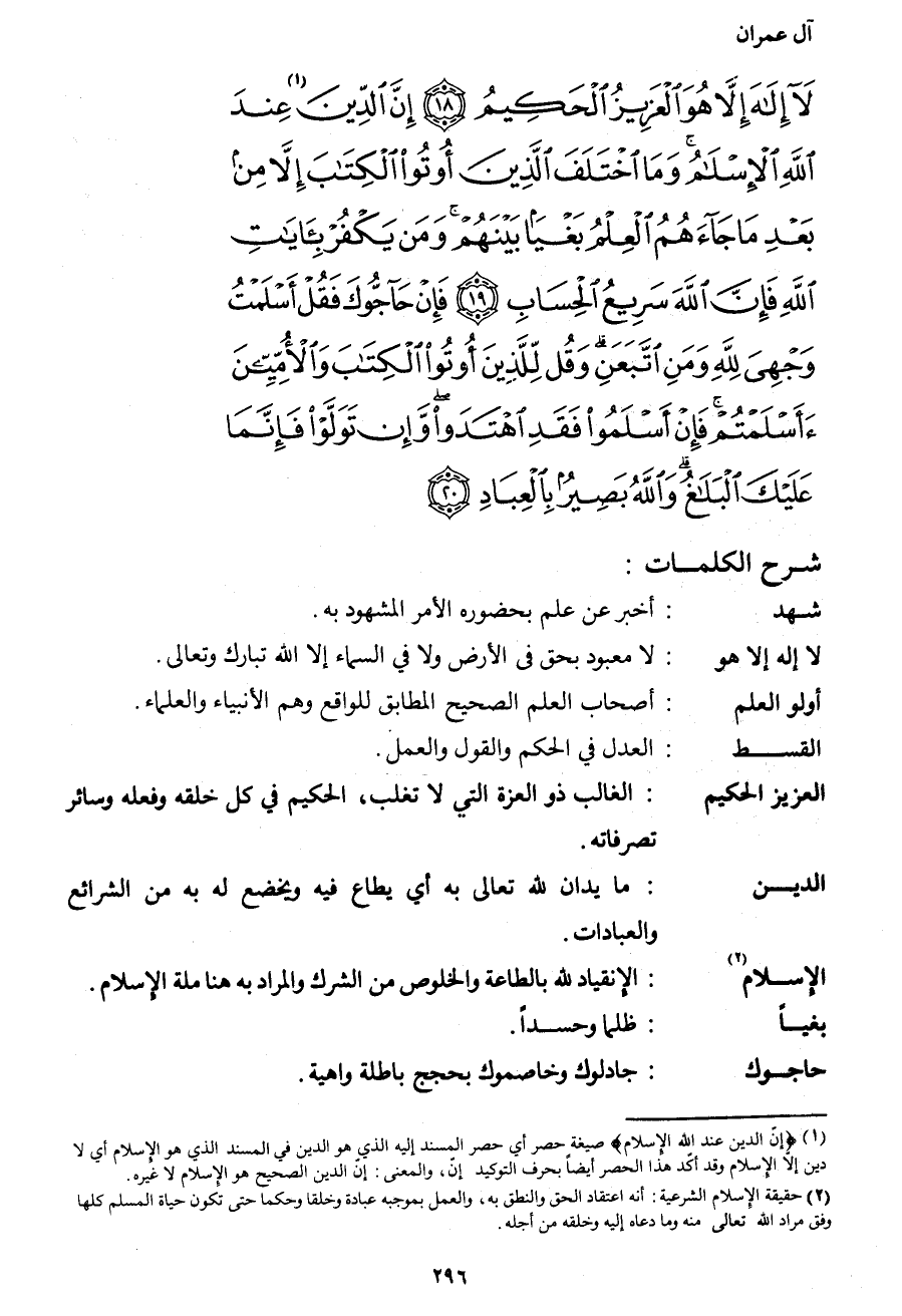 لا إِلَهَ إِلا هُوَ الْعَزِيزُ الْحَكِيمُ (18) إِنَّ الدِّينَ1 عِنْدَ اللهِ الإِسْلامُ وَمَا اخْتَلَفَ الَّذِينَ أُوتُوا الْكِتَابَ إِلا مِنْ بَعْدِ مَا جَاءَهُمُ الْعِلْمُ بَغْياً بَيْنَهُمْ وَمَنْ يَكْفُرْ بِآيَاتِ اللهِ فَإِنَّ اللهَ سَرِيعُ الْحِسَابِ (19) فَإِنْ حَاجُّوكَ فَقُلْ أَسْلَمْتُ وَجْهِيَ لِلَّهِ وَمَنِ اتَّبَعَنِ وَقُلْ لِلَّذِينَ أُوتُوا الْكِتَابَ وَالأُمِّيِّينَ أَأَسْلَمْتُمْ فَإِنْ أَسْلَمُوا فَقَدِ اهْتَدَوْا وَإِنْ تَوَلَّوْا فَإِنَّمَا عَلَيْكَ الْبَلاغُ وَاللهُ بَصِيرٌ بِالْعِبَادِ (20) }