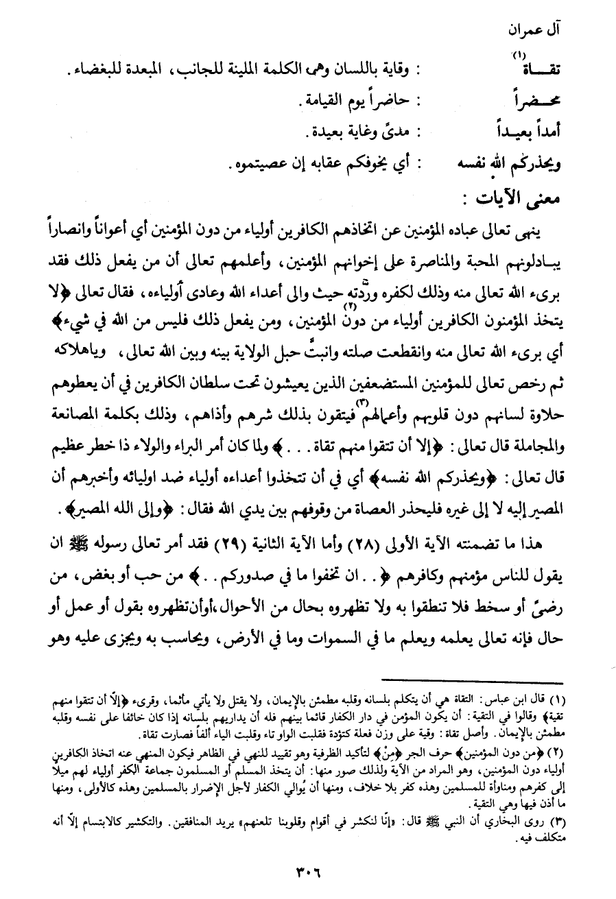 1 قال ابن عباس: "التقاة هي: أن يتكلم بلسانه وقلبه مطمئن بالإيمان، ولا يقتل ولا يأتي مأثماً، وقرئ: {إلا أن تتقوا منهم تقية} ، وقالوا في التقية: أن يكون المؤمن في دار الكفار قائماً بينهم فله أن يداريهم بلسانه إذا كان خائفاً على نفسه وقلبه مطمئن بالإيمان. وأصل تقاة: وقي على وزن فعلة، كتؤدة، فقلبت الواو تاء وقلبت الياء ألفاً فصارت تقاة.