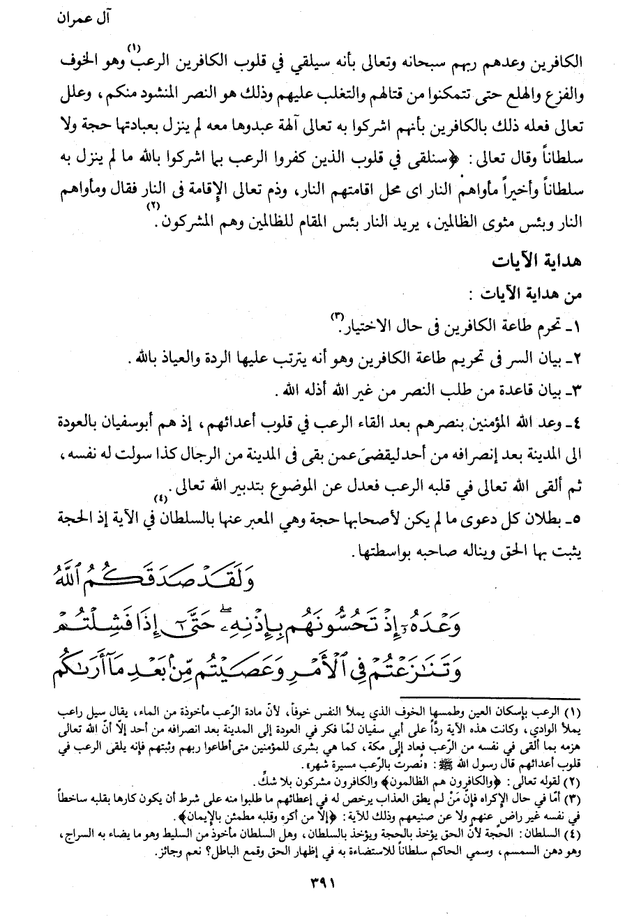 1 الرعب بإسكان العين وطمسها الخوف الذي يملأ النفس خوفاً، لأن مادة الرعب مأخوذة من الماء، يقال: سيل راعب يملأ الوادي، وكانت هذه الآية رداً على أبي سفيان لما فكر في العودة إلى المدينة بعد انصرافه من أحد، إلا أن الله تعالى هزمه لما ألقى في نفسه من الرعب، فعاد إلى مكة، كما هي بشرى للمؤمنين متى أطاعوا ربهم وثبتهم فإنه يلقى الرعب في قلوب أعدائهم، قال رسول الله صَلَّى اللهُ عَلَيْهِ وَسَلَّمَ: "نصرت بالرعب مسيرة شهر.
