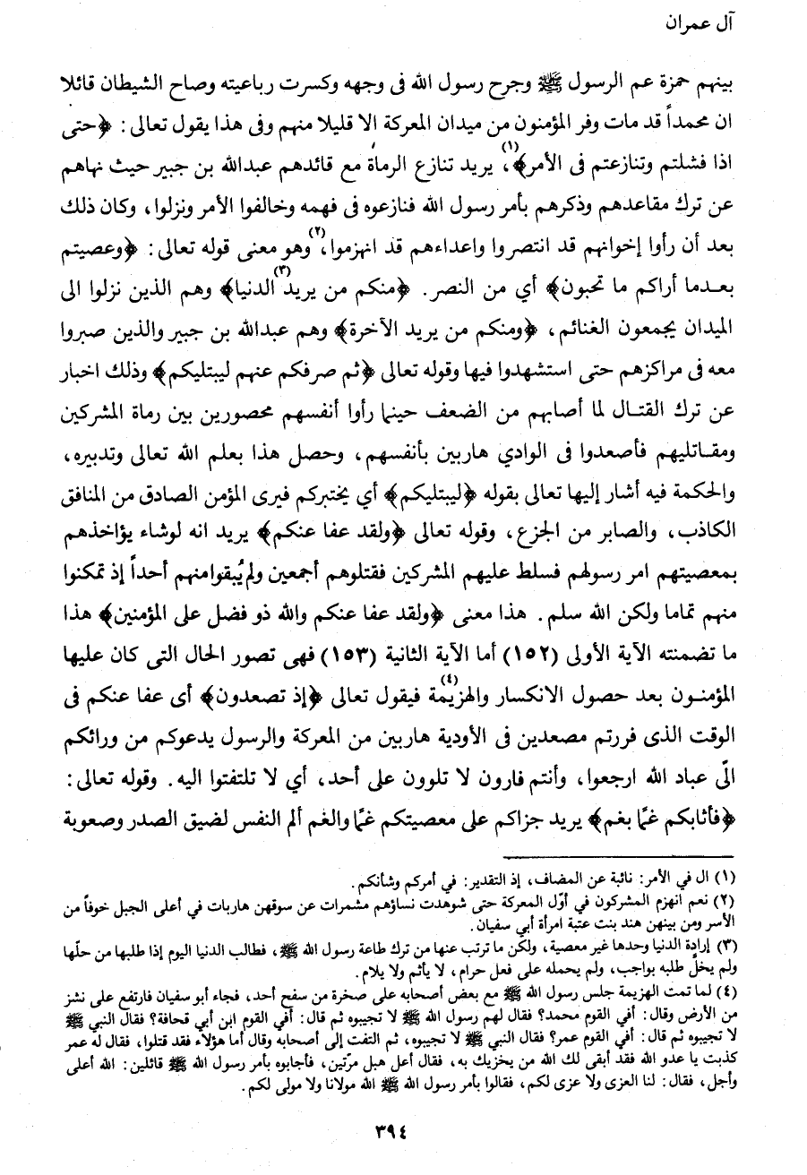 بينهم حمزة عم الرسول صَلَّى اللهُ عَلَيْهِ وَسَلَّمَ، وجرح رسول الله في وجه، وكسرت رباعيته، وصاح الشيطان قائلاً: إن محمداً قد مات، وفر المؤمنون من ميدان المعركة إلا قليلاً منهم، وفي هذا يقول تعالى: {حَتَّى إِذَا فَشِلْتُمْ وَتَنَازَعْتُمْ فِي الأَمْرِ1} يريد تنازع الرماة مع قائدهم عبد الله بن جبير، حيث نهاهم عن ترك مقاعدهم وذكرهم بأمر رسول الله صَلَّى اللهُ عَلَيْهِ وَسَلَّمَ فنازعوه في فهمه وخالفوا الأمر ونزلوا، وكان ذلك بعد أن رأوا إخوانهم قد انتصروا وأعدائهم قد انهزموا2، وهو معنى قوله تعالى: {وَعَصَيْتُمْ مِنْ بَعْدِ مَا أَرَاكُمْ مَا تُحِبُّونَ} أي: من النصر {مِنْكُمْ مَنْ يُرِيدُ3 الدُّنْيَا} وهم الذين نزلوا إلى الميدان يجمعون الغنائم، {وَمِنْكُمْ مَنْ يُرِيدُ الآخِرَةَ} وهم: عبد الله بن جبير والذين صبروا معه في مراكزهم حتى استشهدوا فيها، وقوله تعالى: {ثُمَّ صَرَفَكُمْ عَنْهُمْ لِيَبْتَلِيَكُمْ} وذلك إخبار عن ترك القتال لما أصابهم من الضعف حينما رأوا أنفسهم محصورين بين رماة المشركين ومقاتليهم فأصعدوا في الوادي هاربين بأنفسهم، وحصل هذا بعلم الله تعالى وتدبيره، والحكمة فيه أشار إليها تعالى بقوله: {لِيَبْتَلِيَكُمْ} أي: يختبركم فيرى المؤمن الصادق من المنافق الكاذب، والصابر من الجزع، وقوله تعالى: {وَلَقَدْ عَفَا عَنْكُمْ} يريد أنه لو شاء يؤاخذهم بمعصيتهم أمر رسوله، فسلط عليهم المشركين فقتلوهم أجمعين، ولم يبقوا منهم أحداً إذ تمكنوا منهم تماماً ولكن الله سلم. هذا معنى: {وَلَقَدْ عَفَا عَنْكُمْ وَاللهُ ذُو فَضْلٍ عَلَى الْمُؤْمِنِينَ} هذا ما تضمنته الآية الأولى (152) ، أما الآية الثانية (153) فهي تصور الحال التي كان عليها المؤمنون بعد حصول الانكسار والهزيمة4 فيقول تعالى: {إِذْ تُصْعِدُونَ} أي: عفا عنكم في الوقت الذي فررتم في المصعدين في الأودية هاربين من المعركة والرسول يدعوكم من ورائكم إليَّ عباد الله ارجعوا، وأنتم فارون لا تلوون على أحد، أي: لا تلتفتوا إليه. وقوله تعالى: {فَأَثَابَكُمْ غَمّاً بِغَمٍّ} يريد جزاكم على معصيتكم غماً، والغم: ألم النفس لضيق الصدر وصعوبة