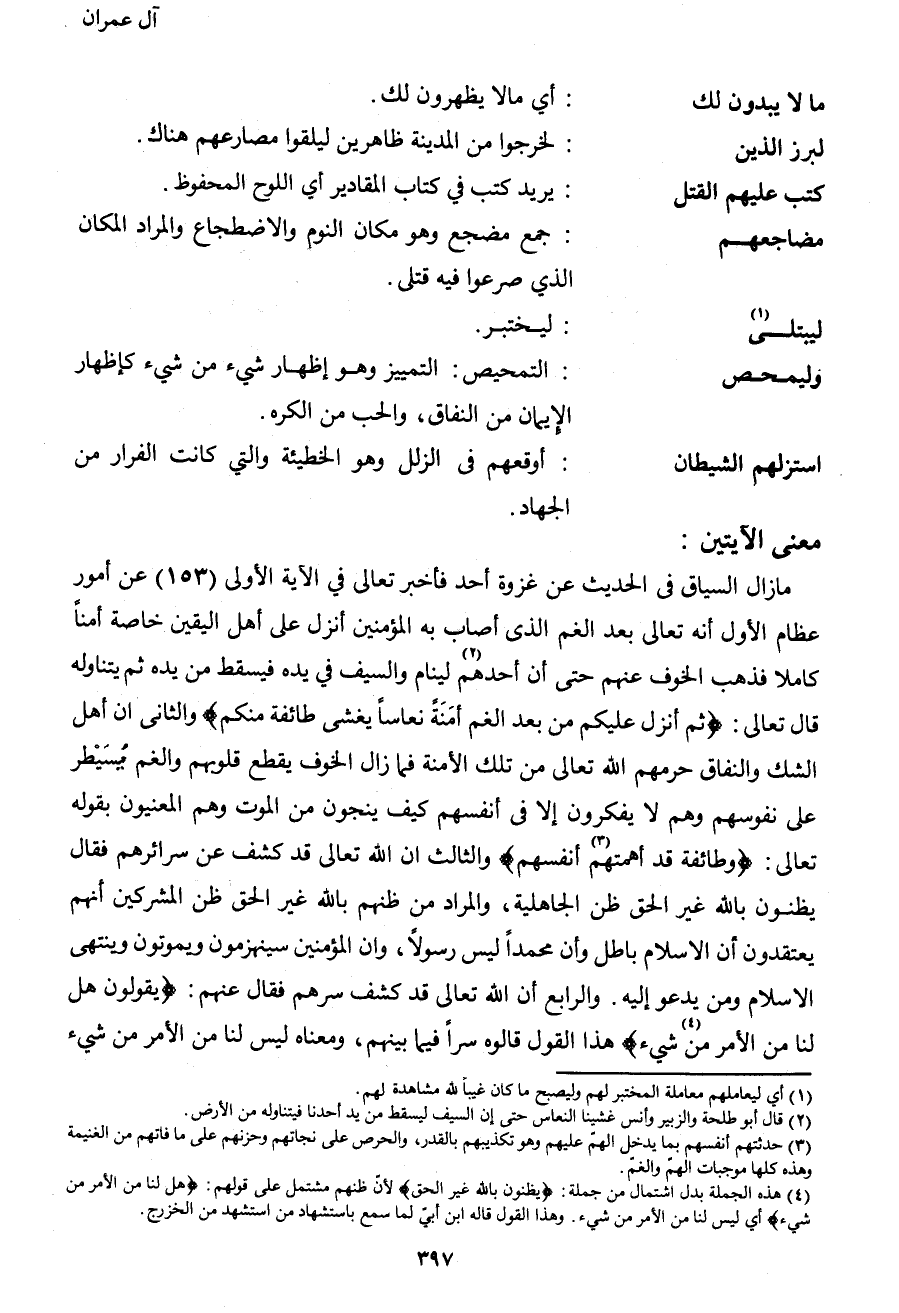 ما زال الساق في الحديث عن غزوة أحد فأخبر تعالى في الآية الأولى (153) عن أمور عظام: الأول: أنه تعالى بعد الغم الذي أصاب به المؤمنين أنزل على أهل اليقين خاصة أمناً كاملاً فذهب الخوف عنهم حتى أن أحدهم2 لينام والسيف في يده فيسقط من يده ثم يتناوله، قال تعالى: {ثُمَّ أَنْزَلَ عَلَيْكُمْ مِنْ بَعْدِ الْغَمِّ أَمَنَةً نُعَاساً يَغْشَى طَائِفَةً مِنْكُمْ} ، والثاني: أن أهل الشرك والنفاق حرمهم الله تعالى من تلك الأمنة فما زال الخوف يقطع قلوبهم، والغم يسيطر على أنفسهم وهم لا يفكرون إلا في أنفسهم كيف ينجون من الموت، وهم المعنيون بقوله تعالى: {وَطَائِفَةٌ قَدْ أَهَمَّتْهُمْ3 أَنْفُسُهُمْ} ، والثالث: أن الله تعالى قد كشف عن سرائرهم، فقال: {يَظُنُّونَ بِاللهِ غَيْرَ الْحَقِّ ظَنَّ الْجَاهِلِيَّةِ} ، والمراد من ظنهم بالله غير الحق ظن المشركين أنهم يعتقدون أن الإسلام باطل وأن محمداً ليس رسولاً، وأن المؤمنين سيهزمون ويموتون وينتهي الإسلام ومن يدعو إليه. والرابع: أن الله تعالى قد كشف سرهم فقال عنهم: {يَقُولُونَ هَلْ لَنَا مِنَ الأَمْرِ مِنْ4 شَيْءٍ} هذا القول قالوه سراً فيما بينهم، ومعناه ليس لنا من الأمر من شيء