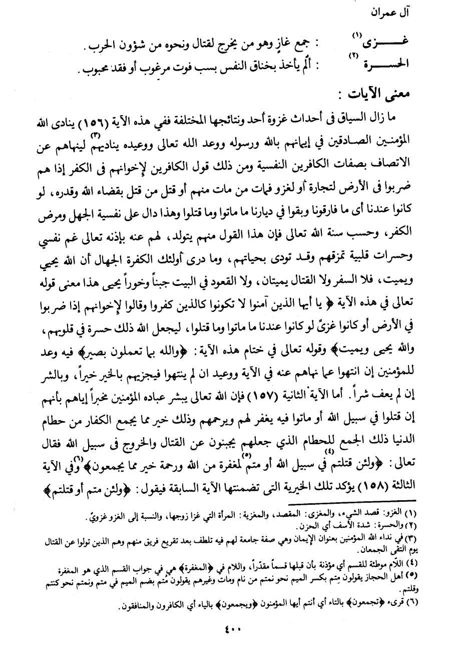 ما زال السياق في أحداث غزوة أحد ونتائجها المختلفة، ففي هذه الآية (156) ينادي الله المؤمنين الصادقين في إيمانهم بالله ورسوله ووعد الله تعالى ووعيده يناديهم3 لينهاهم عن الاتصاف بصفات الكافرين النفسية وهو من ذلك قول الكافرين لإخوانهم في الكفر: إذ هم ضربوا في الأرض لتجارة أو لغزو فمات من مات منهم أو قتل من قتل بقضاء الله وقدره، لو كانوا عندنا، أي: ما فارقونا وبقوا في ديارنا ما ماتوا وما قتلوا وهذا دال على نفسية الجهل ومرض الكفر، وحسب سنة الله تعالى فإن هذا القول منهم يتولد، لهم عنه بإذنه تعالى غم نفسي وحسرات قلبية تمزقهم، وقد تودي بحياتهم، وما درى أولئك الكفرة الجهال أن الله يحيي ويميت، فلا السفر ولا القتال يميتان، ولا القعود في البيت جبناً وخوراً يحيي، هذا معنى قوله تعالى في هذه الآية: {يَا أَيُّهَا الَّذِينَ آمَنُوا لا تَكُونُوا كَالَّذِينَ كَفَرُوا وَقَالُوا لإِخْوَانِهِمْ إِذَا ضَرَبُوا فِي الأَرْضِ أَوْ كَانُوا غُزّىً لَوْ كَانُوا عِنْدَنَا مَا مَاتُوا وَمَا قُتِلُوا لِيَجْعَلَ اللهُ ذَلِكَ حَسْرَةً فِي قُلُوبِهِمْ وَاللهُ يُحْيِي وَيُمِيتُ} وقوله تعالى في ختام هذه الآية: {وَاللهُ بِمَا تَعْمَلُونَ بَصِيرٌ} في وعد للمؤمنين إن انتهوا عما نهاهم عنه في الآية ووعيد إن لم ينتهوا فيجزيهم بالخير خيراً، وبالشر إن لم يعفوا شراً. أما الآية الثانية (157) فإن الله تعالى يبشر عباده المؤمنين مخبراً إياهم بأنهم إن قتلوا في سبيل الله أو ماتوا فيه يغفر لهم ويرحمهم وذلك خير مما يجمع الكفار من حطام الدنيا ذلك الجمع للحطام الذي جعلهم يجبنون على القتال والخروج في سبيل الله فقال تعالى: {وَلَئِنْ قُتِلْتُمْ4 فِي سَبِيلِ اللهِ أَوْ مُتُّمْ5 لَمَغْفِرَةٌ مِنَ اللهِ وَرَحْمَةٌ خَيْرٌ مِمَّا يَجْمَعُونَ6} ، وفي الآية الثالثة (158) يؤكد تلك الخيرية التي تضمنتها الآية السابقة فيقول: {وَلَئِنْ مُتُّمْ أَوْ قُتِلْتُمْ}