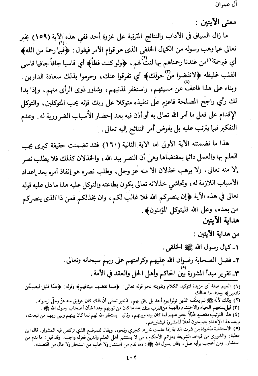 هذا ما تضمنته الآية الأولى، أما الآية الثانية (160) فقد تضمنت حقيقة كبرى يجب العلم بها والعمل دائماً بمقتضاها، وهي أن النصر بيد الله، والخذلان كذلك فلا يطلب نصر إلا منه تعالى، ولا يرهب خذلان إلا منه عز وجل، وطلب نصره هو إنفاذ أمره بعد إعداد الأسباب اللازمة له، وتحاشي خذلانه تعالى يكون بطاعته والتوكل عليه هذا ما دل عليه قوله تعالى في هذه الآية: {إِنْ يَنْصُرْكُمُ اللهُ فَلا غَالِبَ لَكُمْ وَإِنْ يَخْذُلْكُمْ فَمَنْ ذَا الَّذِي يَنْصُرُكُمْ مِنْ بَعْدِهِ وَعَلَى اللهِ فَلْيَتَوَكَّلِ الْمُؤْمِنُونَ} .