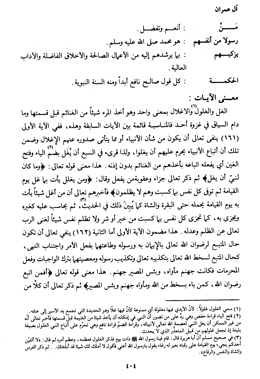 الغل والغلول1 والإغلال بمعنى واحد، وهو أخذ المرء شيئاً من الغنائم قبل قسمتها وما دام السياق في غزوة أحد، فالمناسبة قائمة بين الآيات وهذه، ففي الآية الأولى (161) ينفي تعالي أن يكون من شأن الأنبياء أو مما يتأتى صدوره عنهم الإغلال وضمن تلك أن أتباع الأنبياء يحرم عليهم أن يغلوا، ولذا قرئ في السبع أن يُغل بضم2 الياء وفتح الغين، أي: يفعله أتباعه بأخذهم من الغنائم بدون إذنه. هذا معنى قوله تعالى: {وَمَا كَانَ لِنَبِيٍّ أَنْ يَغُلَّ} ثم ذكر تعالى جزاء وعقوبة من يفعل وقال: {وَمَنْ يَغْلُلْ يَأْتِ بِمَا غَلَّ يَوْمَ الْقِيَامَةِ ثُمَّ تُوَفَّى كُلُّ نَفْسٍ مَا كَسَبَتْ وَهُمْ لا يُظْلَمُونَ} فأخبرهم تعالى أن من أغل شيئاً يأت به يوم القيامة يحمله حتى البقرة والشاة كما يبين ذلك في الحديث3، ثم يحاسب عليه كغيره ويجزي به، كما تجزى كل نفس بما كسبت من خير أو شر ولا تظلم نفس شيئاً لغنى الرب تعالى عن الظلم وعدله. هذا مضمون الآية الأولى، أما الثانية (162) ينفي تعالى أن تكون حال المتبع لرضوان الله تعالى بالإيمان به ورسوله وطاعتهما بفعل الأمر واجتناب النهي، كحال المتبع لسخط الله تعالى بتكذيبه تعالى وتكذيب رسوله ومعصيتهما بترك الواجبات وفعل المحرمات فكانت جهنم مأواه، وبئس المصير جهنم. هذا معنى قوله تعالى: {أَفَمَنِ اتَّبَعَ رِضْوَانَ اللهِ كَمَنْ بَاءَ بِسَخَطٍ مِنَ اللهِ وَمَأْوَاهُ جَهَنَّمُ وَبِئْسَ الْمَصِيرُ} ثم ذكر تعالى أن كلاً من