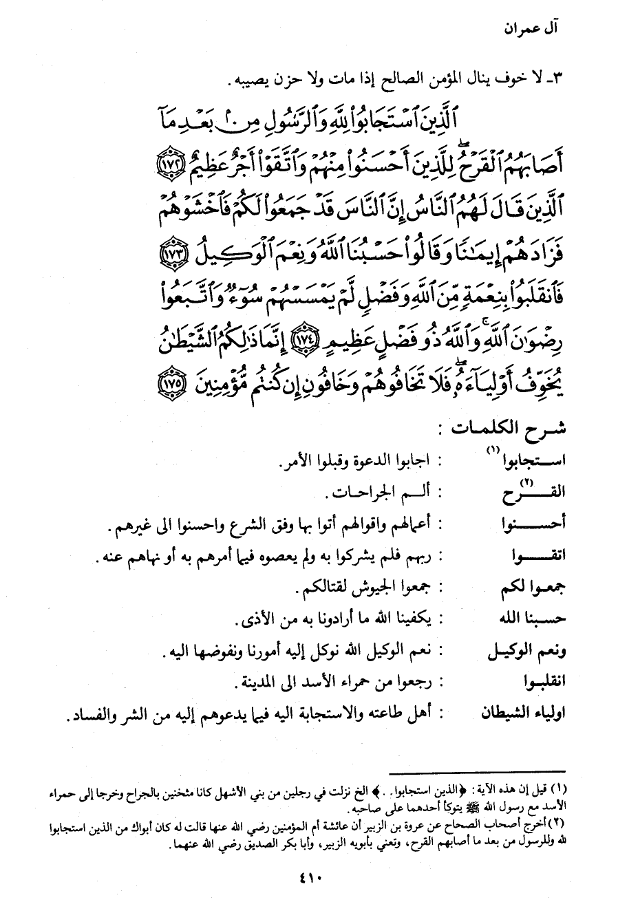 {الَّذِينَ اسْتَجَابُوا لِلَّهِ وَالرَّسُولِ مِنْ بَعْدِ مَا أَصَابَهُمُ الْقَرْحُ لِلَّذِينَ أَحْسَنُوا مِنْهُمْ وَاتَّقَوْا أَجْرٌ عَظِيمٌ (172) الَّذِينَ قَالَ لَهُمُ النَّاسُ إِنَّ النَّاسَ قَدْ جَمَعُوا لَكُمْ فَاخْشَوْهُمْ فَزَادَهُمْ إِيمَاناً وَقَالُوا حَسْبُنَا اللهُ وَنِعْمَ الْوَكِيلُ (173) فَانْقَلَبُوا بِنِعْمَةٍ مِنَ اللهِ وَفَضْلٍ لَمْ يَمْسَسْهُمْ سُوءٌ وَاتَّبَعُوا رِضْوَانَ اللهِ وَاللهُ ذُو فَضْلٍ عَظِيمٍ (174) إِنَّمَا ذَلِكُمُ الشَّيْطَانُ يُخَوِّفُ أَوْلِيَاءَهُ فَلا تَخَافُوهُمْ وَخَافُونِ إِنْ كُنْتُمْ مُؤْمِنِينَ (175) }