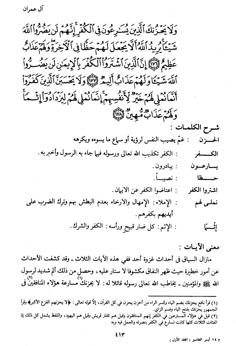 {وَلا يَحْزُنْكَ الَّذِينَ يُسَارِعُونَ فِي الْكُفْرِ إِنَّهُمْ لَنْ يَضُرُّوا اللهَ شَيْئاً يُرِيدُ اللهُ أَلا يَجْعَلَ لَهُمْ حَظّاً فِي الآخِرَةِ وَلَهُمْ عَذَابٌ عَظِيمٌ (176) إِنَّ الَّذِينَ اشْتَرَوُا الْكُفْرَ بِالأِيمَانِ لَنْ يَضُرُّوا اللهَ شَيْئاً وَلَهُمْ عَذَابٌ أَلِيمٌ (177) وَلا يَحْسَبَنَّ الَّذِينَ كَفَرُوا أَنَّمَا نُمْلِي لَهُمْ خَيْرٌ لأَنْفُسِهِمْ إِنَّمَا نُمْلِي لَهُمْ لِيَزْدَادُوا إِثْماً وَلَهُمْ عَذَابٌ مُهِينٌ (178) }