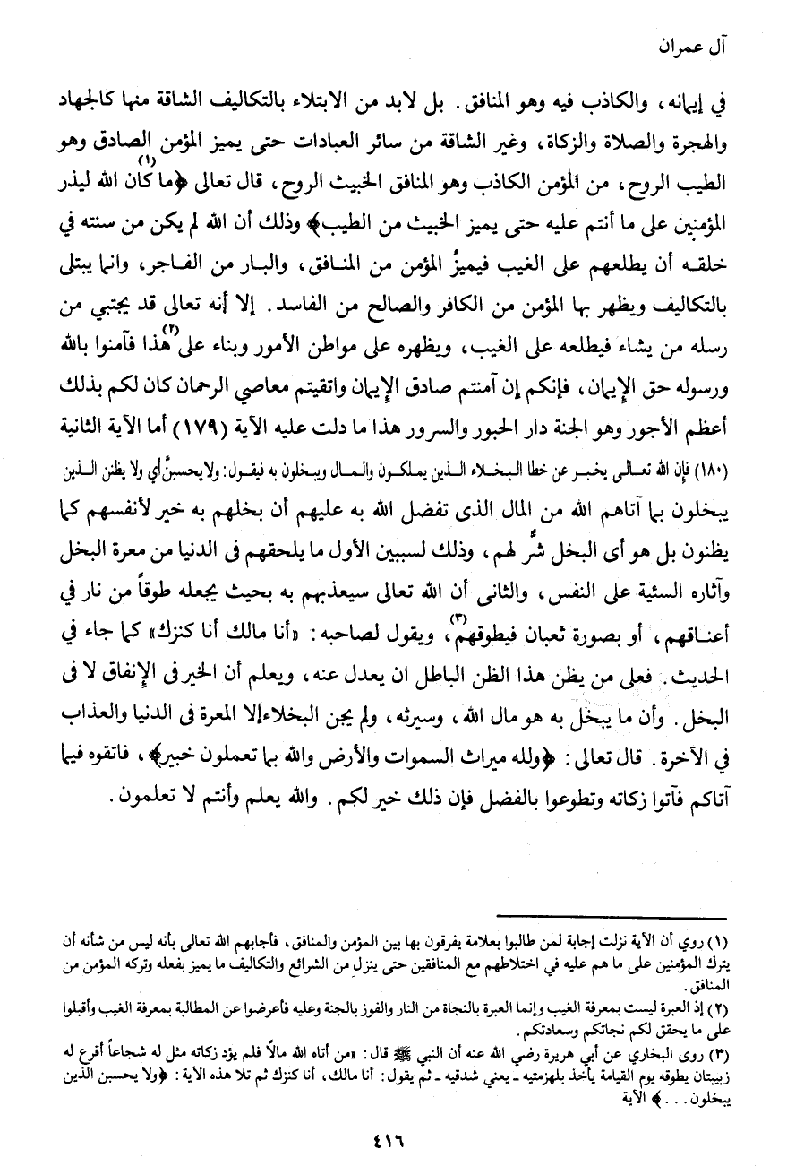 في إيمانه، والكاذب فيه وهو المنافق. بل لا بد من الابتلاء بالتكاليف الشاقة منها؛ كالجهاد والهجرة والصلاة والزكاة، وغير الشاقة من سائر العبادات حتى يميز المؤمن الصادق وهو الطيب الروح، من المؤمن الكاذب وهو المنافق الخبيث الروح، قال تعالى: {مَا كَانَ1 اللهُ لِيَذَرَ الْمُؤْمِنِينَ عَلَى مَا أَنْتُمْ عَلَيْهِ حَتَّى يَمِيزَ الْخَبِيثَ مِنَ الطَّيِّبِ} وذلك أن الله لم يكن من سننه في خلقه أن يطلعهم على الغيب فيميز المؤمن من المنافق، والبار من الفاجر، وإنما يبتلي بالتكاليف ويظهر بها المؤمن من الكافر والصالح من الفاسد. إلا أنه تعالى قد يجتبي من رسله من يشاء فيطلعه على الغيب، ويظهره على مواطن الأمور وبناء على هذا2 فآمنوا بالله ورسله حق الإيمان، فإنكم إن آمنتم صادق الإيمان واتقيتم معاصي الرحمان كان لكم بذلك أعظم الأجور وهو الجنة دار الحبور والسرور هذا ما دلت عليه الآية (179) ، أما الآية الثانية (180) فإن الله تعالى يخبر عن خط البخلاء الذين يملكون المال ويبخلون به فيقول: ولا يحسن أي ولا يظن الذين يبخلون بما آتاهم الله من المال الذي تفضل الله به عليهم أن بخلهم به خير لأنفسهم كما يظنون بل هو أي البخل شر لهم، وذلك لسببين الأول: ما يلحقهم في الدنيا من معرة البخل وآثاره السيئة على النفس، والثاني: أن الله تعالى سيعذبهم به بحيث يجعله طوقاً من نار في أعناقهم، أو بصورة ثعبان فيطوقهم3، ويقول لصاحبه: "أنا مالك أنا كنزك" كما جاء في الحديث. فعلى من يظن هذا الظن الباطل أن يعدل عنه، ويعلم أن الخير في الإنفاق لا في البخل. وأن ما يبخل به هو مال الله، وسيرثه، ولم يجن البخلاء إلا المعرة في الدنيا والعذاب في الآخرة. قال تعالى: {وَلِلَّهِ مِيرَاثُ السَّمَاوَاتِ وَالأَرْضِ وَاللهُ بِمَا تَعْمَلُونَ خَبِيرٌ} ، فاتقوه فيما آتاكم فآتوا زكاته وتطوعوا بالفضل فإن ذلك خير لكم. والله يعلم وأنتم لا تعلمون.