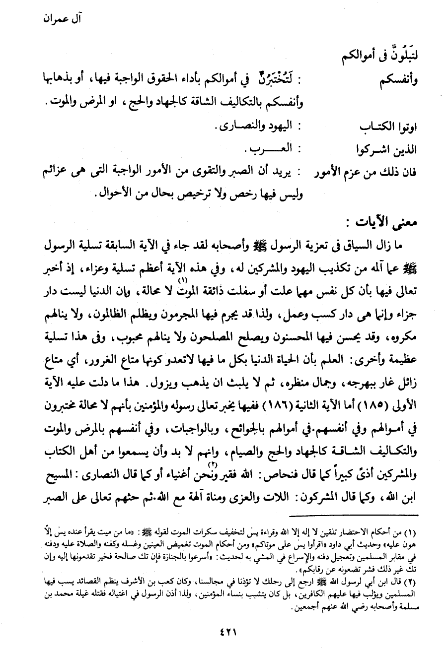 ما زال السياق في تعزية الرسول صَلَّى اللهُ عَلَيْهِ وَسَلَّمَ وأصحابه، لقد جاء في الآية السابقة تسلية الرسول صَلَّى اللهُ عَلَيْهِ وَسَلَّمَ عما آلمه من تكذيب اليهود والمشركين له، وفي هذه الآية أعظم تسلية وعزاء، إذ أخبر تعالى فيها بأن كل نفس مهما علت أو سفلت ذائقة الموت1 لا محالة، وإن الدنيا ليست دار جزاء وإنما هي دار كسب وعمل، ولذا قد يجرم فيها المجرمون ويظلم الظالمون، ولا ينالهم مكروه، وقد يحسن فيها المحسنون ويصلح المصلحون ولا ينالهم محبوب، وفي هذا تسلية عظيمة وأخرى: العلم بأن الحياة الدنيا بكل ما فيها لا تعدو كونها متاع الغرور، أي: متاع زائل غار ببهرجه وجمال منظره، ثم لا يلبث أن يذهب ويزول. هذا ما دلت عليه الآية الأولى (185) ، أما الآية الثانية (186) ففيها يخبر تعالى رسوله والمؤمنين بأنهم لا محالة مختبرون في أموالهم وفي أنفسهم. في أموالهم بالحوائج، وبالواجبات، وفي أنفسهم بالمرض والموت والتكاليف الشاقة؛ كالجهاد والحج والصيام، وإنهم لا بد وأن يسمعوا من أهل الكتاب والمشركين أذى كبيراً كما قال فنحاص: الله فقير2 ونحن أغنياء أو كما قال النصارى: المسيح ابن الله، وكما قال المشركون: اللات والعزى ومناة آلهة مع الله. حثهم تعالى على الصبر