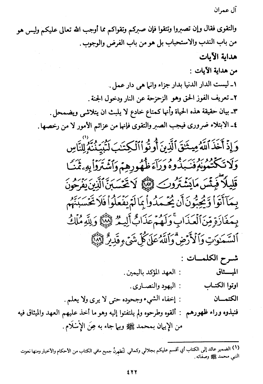 {وَإِذْ أَخَذَ اللهُ مِيثَاقَ الَّذِينَ أُوتُوا الْكِتَابَ لَتُبَيِّنُنَّهُ1 لِلنَّاسِ وَلا تَكْتُمُونَهُ فَنَبَذُوهُ وَرَاءَ ظُهُورِهِمْ وَاشْتَرَوْا بِهِ ثَمَناً قَلِيلاً فَبِئْسَ مَا يَشْتَرُونَ (187) لا تَحْسَبَنَّ الَّذِينَ يَفْرَحُونَ بِمَا أَتَوْا وَيُحِبُّونَ أَنْ يُحْمَدُوا بِمَا لَمْ يَفْعَلُوا فَلا تَحْسَبَنَّهُمْ بِمَفَازَةٍ مِنَ الْعَذَابِ وَلَهُمْ عَذَابٌ أَلِيمٌ (188) وَلِلَّهِ مُلْكُ السَّمَاوَاتِ وَالأَرْضِ وَاللهُ عَلَى كُلِّ شَيْءٍ قَدِيرٌ (189) }