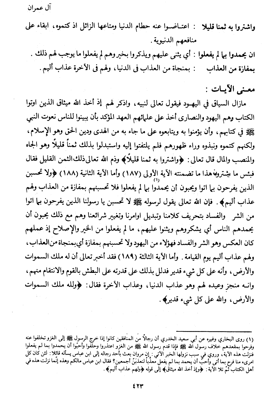 1 روى البخاري وغيره عن أبي سعيد الخدري: أن رجالاً من المنافقين كانوا إذا خرج الرسول صَلَّى اللهُ عَلَيْهِ وَسَلَّمَ إلى الغزو تخلفوا عنه وفرحوا بمقعدهم خلاف رسول الله صَلَّى اللهُ عَلَيْهِ وَسَلَّمَ، فإذا قدم رسول الله صَلَّى اللهُ عَلَيْهِ وَسَلَّمَ من الغزو اعتذروا وحلفوا وأحبوا أن يحمدوا بما لم يفعلوا، فنزلت هذه الآية. وروي في سبب نزولها الخبر الآتي: إن مروان بعث بأحد رجاله إلى ابن عباس يسأله قائلاً: لئن كان كل امرئ منا فرح بما أتى وأحب أن يحمد بما لم يفعل معذباً لنعذبن أجمعين؟ فقال ابن عباس: "ما لكم وهذه إنما نزلت هذه في أهل الكتاب، ثم تلا هذه الآية: {وَإِذْ أَخَذَ اللهُ مِيثَاقَ} إلى قوله: {ولَهمْ عَذَابْ أليِم} .