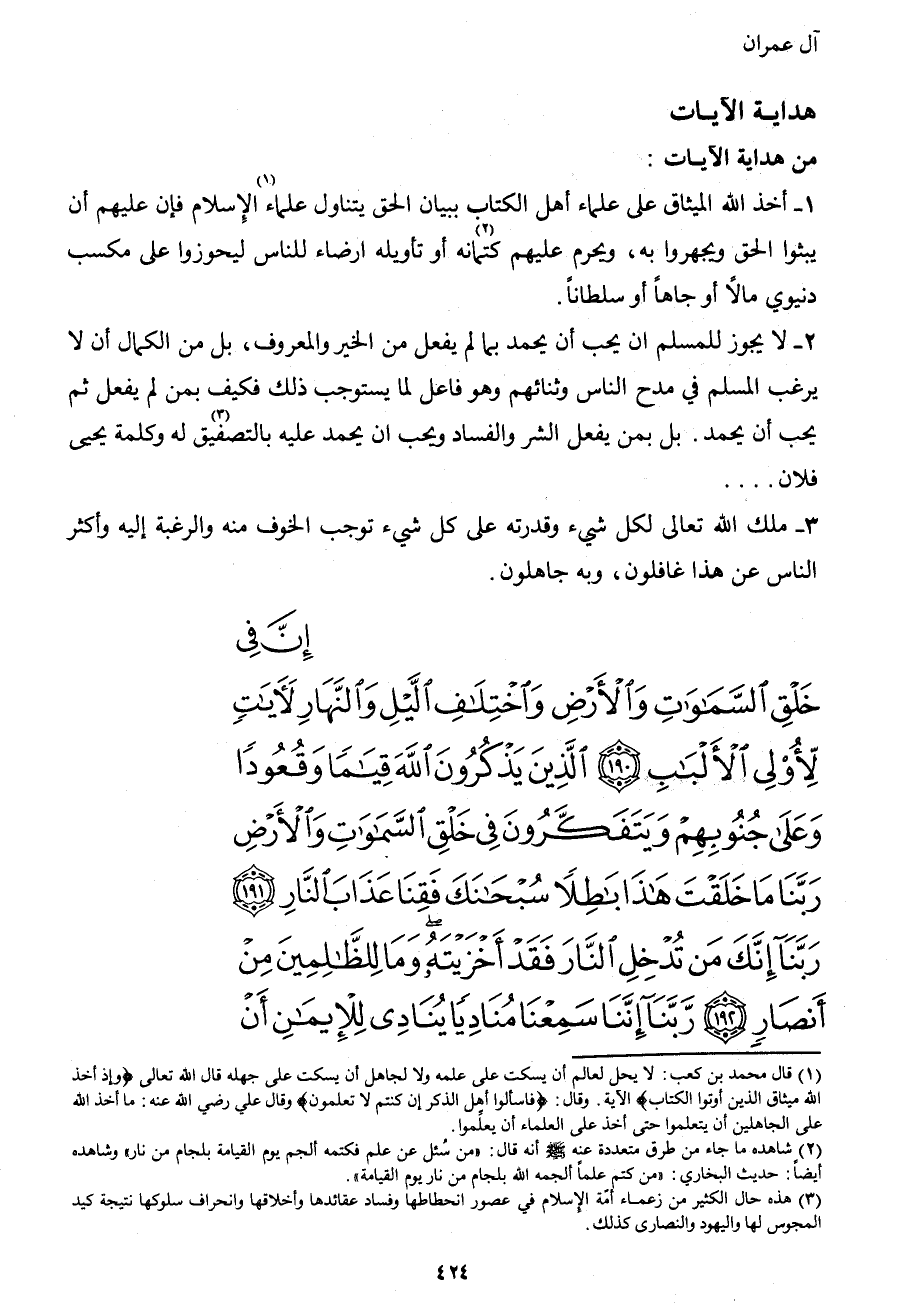 {إِنَّ فِي خَلْقِ السَّمَاوَاتِ وَالأَرْضِ وَاخْتِلافِ اللَّيْلِ وَالنَّهَارِ لآياتٍ لأُولِي الأَلْبَابِ (190) الَّذِينَ يَذْكُرُونَ اللهَ قِيَاماً وَقُعُوداً وَعَلَى جُنُوبِهِمْ وَيَتَفَكَّرُونَ فِي خَلْقِ السَّمَاوَاتِ وَالأَرْضِ رَبَّنَا مَا خَلَقْتَ هَذَا بَاطِلاً سُبْحَانَكَ فَقِنَا عَذَابَ النَّارِ (191) رَبَّنَا إِنَّكَ مَنْ تُدْخِلِ النَّارَ فَقَدْ أَخْزَيْتَهُ وَمَا لِلظَّالِمِينَ مِنْ أَنْصَارٍ (192) رَبَّنَا إِنَّنَا سَمِعْنَا مُنَادِياً يُنَادِي لِلإِيمَانِ أَنْ