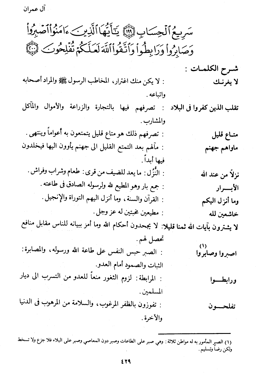 {اصْبِرُوا وَصَابِرُوا1} : الصبر: حبس النفس على طاعة الله ورسولهن والمصابرة: الثبات والصمود أمام العدو.