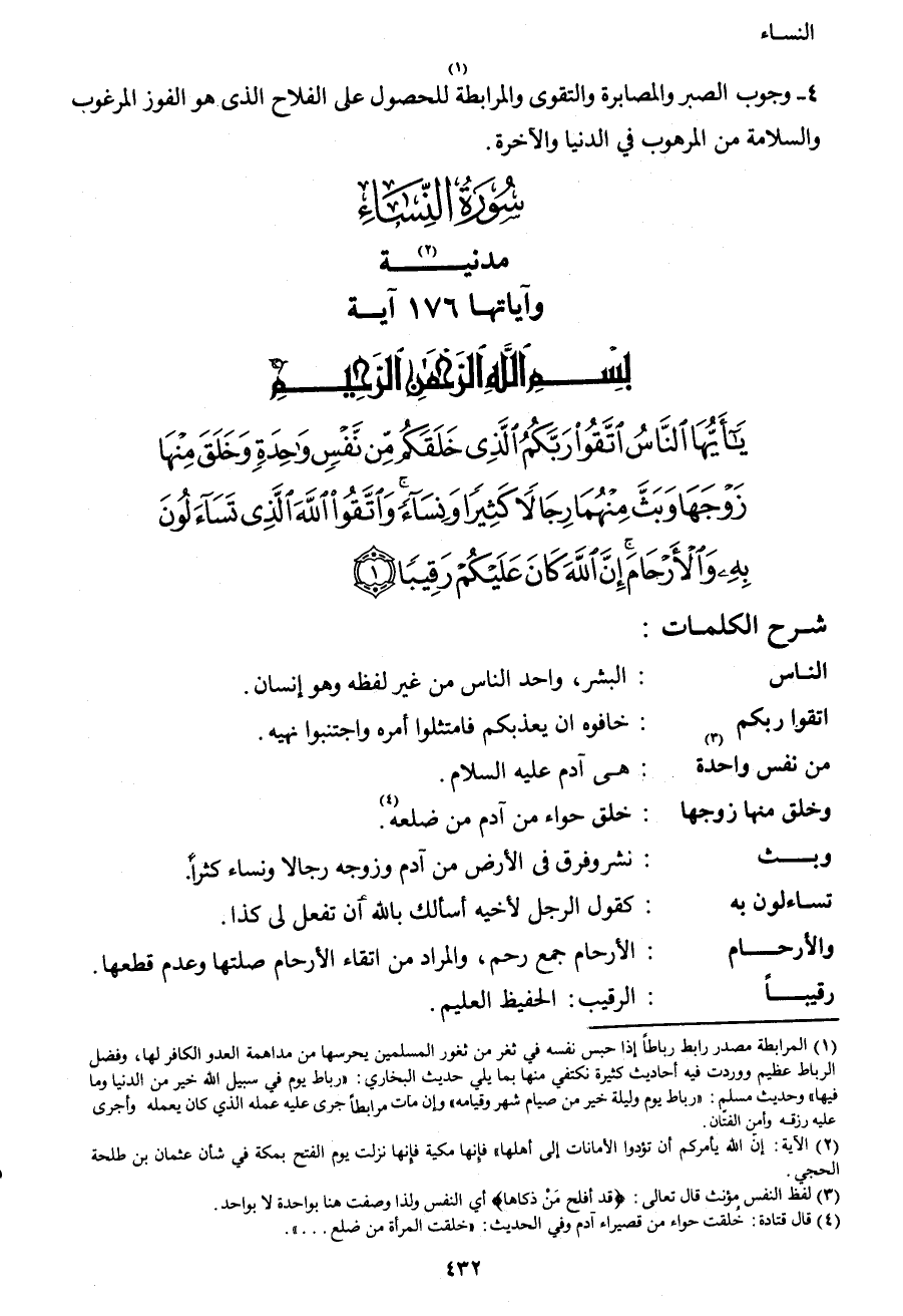 {يَا أَيُّهَا النَّاسُ اتَّقُوا رَبَّكُمُ الَّذِي خَلَقَكُمْ مِنْ نَفْسٍ وَاحِدَةٍ وَخَلَقَ مِنْهَا زَوْجَهَا وَبَثَّ مِنْهُمَا رِجَالاً كَثِيراً وَنِسَاءً وَاتَّقُوا اللهَ الَّذِي تَسَاءَلُونَ بِهِ وَالأَرْحَامَ إِنَّ اللهَ كَانَ عَلَيْكُمْ رَقِيباً (1) }