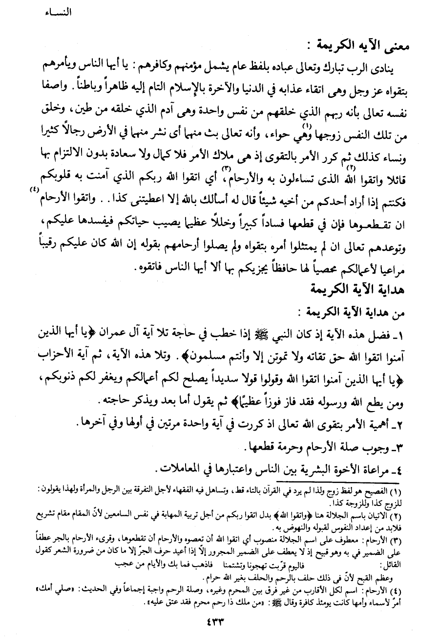 ينادي الرب تبارك وتعالى عباده بلفظ عام يشمل مؤمنهم وكافرهم: {يَا أَيُّهَا النَّاسُ} ويأمرهم بتقواه عز وجل وهي اتقاء عذابه في الدنيا والآخرة بالإسلام التام إليه ظاهراً وباطناً. واصفاً نفسه تعالى بأنه ربهم الذي خلقهم من نفس واحدة وهي آدم الذي خلقه من طين، وخلق من تلك النفس زوجها1 وهي حواء، وأنه تعالى بث منهما أي: نشر منهما في الأرض رجالاً كثيراً ونساء كذلك ثم كرر الأمر بالتقوى، إذ هي ملاك الأمر، فلا كمال ولا سعادة بدون الالتزام بها قائلاً: {وَاتَّقُوا اللهَ2 الَّذِي تَسَاءَلُونَ بِهِ وَالأَرْحَامَ3} أي: اتقوا الله ربكم الذي آمنت به قلوبكم فكنتم إذا أراد أحدكم من أخيه شيئاً قال له أسألك بالله إلا أعطيتني كذا ... واتقوا الأرحام4 أن تقطعوها فإن في قطعها فساداً كبيراً وخللاً عظيما يصيب حياتكم فيفسدها عليكم، وتوعدهم تعالى إن لم يمتثلوا أمره بتقواه ولم يصلوا أرحامهم بقوله: {إِنَّ اللهَ كَانَ عَلَيْكُمْ رَقِيباً} مراعياً لأعمالكم محصياً لها حافظاً يجزيكم بها ألا أيها الناس فاتقوه.