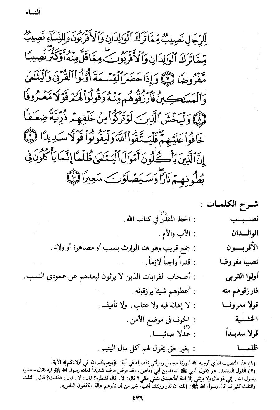 {لِلرِّجَالِ نَصِيبٌ مِمَّا تَرَكَ الْوَالِدَانِ وَالأَقْرَبُونَ وَلِلنِّسَاءِ نَصِيبٌ مِمَّا تَرَكَ الْوَالِدَانِ وَالأَقْرَبُونَ مِمَّا قَلَّ مِنْهُ أَوْ كَثُرَ نَصِيباً مَفْرُوضاً (7) وَإِذَا حَضَرَ الْقِسْمَةَ أُولُو الْقُرْبَى وَالْيَتَامَى وَالْمَسَاكِينُ فَارْزُقُوهُمْ مِنْهُ وَقُولُوا لَهُمْ قَوْلاً مَعْرُوفاً (8) وَلْيَخْشَ الَّذِينَ لَوْ تَرَكُوا مِنْ خَلْفِهِمْ ذُرِّيَّةً ضِعَافاً خَافُوا عَلَيْهِمْ فَلْيَتَّقُوا اللهَ وَلْيَقُولُوا قَوْلاً سَدِيداً (9) إِنَّ الَّذِينَ يَأْكُلُونَ أَمْوَالَ الْيَتَامَى ظُلْماً إِنَّمَا يَأْكُلُونَ فِي بُطُونِهِمْ نَاراً وَسَيَصْلَوْنَ سَعِيراً (10) }