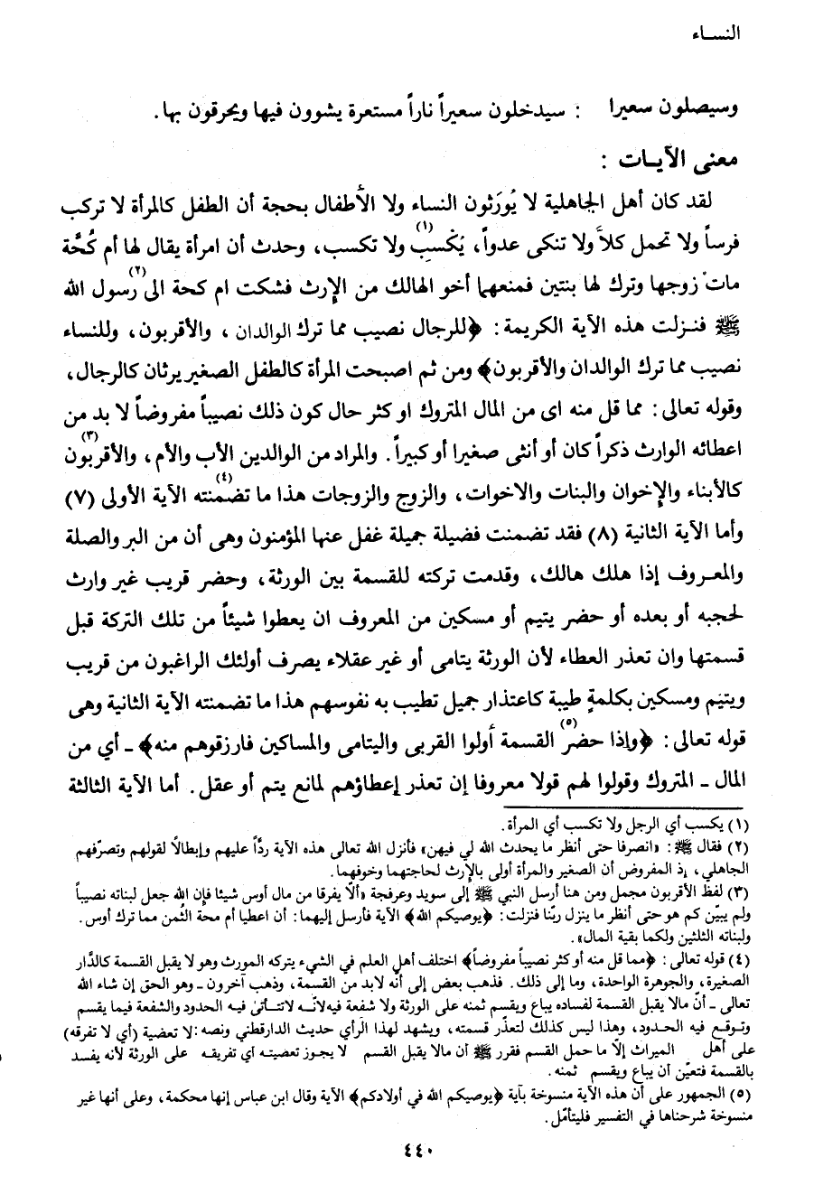 2 فقال صَلَّى اللهُ عَلَيْهِ وَسَلَّمَ: "انصرفا حتى أنظر ما يحدث الله لي فيهن". فأنزل الله تعالى هذه الآية رداً عليهم وإبطالاً لقولهم وتصرفهم الجاهلي، إذا المفروض أن الصغير والمرأة أولى بالإرث لحاجتهما وخوفهما.