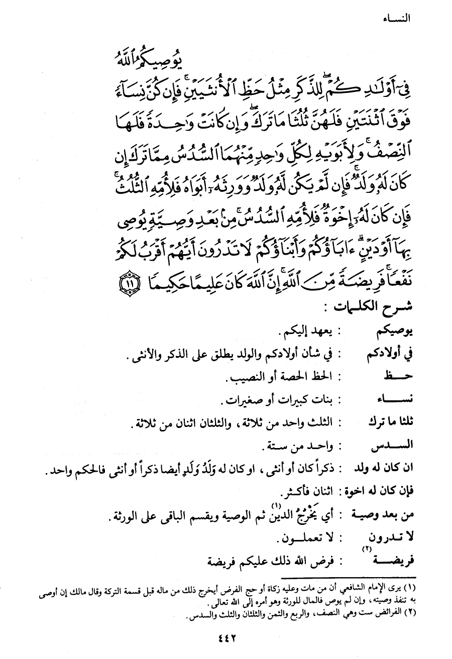 {يُوصِيكُمُ اللهُ فِي أَوْلادِكُمْ لِلذَّكَرِ مِثْلُ حَظِّ الأُنْثَيَيْنِ فَإِنْ كُنَّ نِسَاءً فَوْقَ اثْنَتَيْنِ فَلَهُنَّ ثُلُثَا مَا تَرَكَ وَإِنْ كَانَتْ وَاحِدَةً فَلَهَا النِّصْفُ وَلأَبَوَيْهِ لِكُلِّ وَاحِدٍ مِنْهُمَا السُّدُسُ مِمَّا تَرَكَ إِنْ كَانَ لَهُ وَلَدٌ فَإِنْ لَمْ يَكُنْ لَهُ وَلَدٌ وَوَرِثَهُ أَبَوَاهُ فَلأُمِّهِ الثُّلُثُ فَإِنْ كَانَ لَهُ إِخْوَةٌ فَلأُمِّهِ السُّدُسُ مِنْ بَعْدِ وَصِيَّةٍ يُوصِي بِهَا أَوْ دَيْنٍ آبَاؤُكُمْ وَأَبْنَاؤُكُمْ لا تَدْرُونَ أَيُّهُمْ أَقْرَبُ لَكُمْ نَفْعاً فَرِيضَةً مِنَ اللهِ إِنَّ اللهَ كَانَ عَلِيماً حَكِيماً (11) }