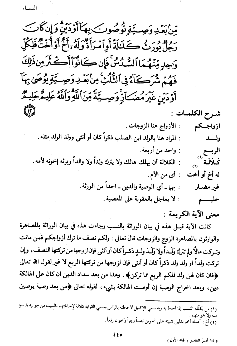 مِنْ بَعْدِ وَصِيَّةٍ تُوصُونَ بِهَا أَوْ دَيْنٍ وَإِنْ كَانَ رَجُلٌ يُورَثُ كَلالَةً أَوِ امْرَأَةٌ وَلَهُ أَخٌ أَوْ أُخْتٌ فَلِكُلِّ وَاحِدٍ مِنْهُمَا السُّدُسُ فَإِنْ كَانُوا أَكْثَرَ مِنْ ذَلِكَ فَهُمْ شُرَكَاءُ فِي الثُّلُثِ مِنْ بَعْدِ وَصِيَّةٍ يُوصَى بِهَا أَوْ دَيْنٍ غَيْرَ مُضَارٍّ وَصِيَّةً مِنَ اللهِ وَاللهُ عَلِيمٌ حَلِيمٌ (12) }