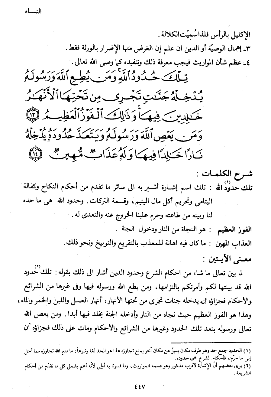 {تِلْكَ حُدُودُ اللهِ وَمَنْ يُطِعِ اللهَ وَرَسُولَهُ يُدْخِلْهُ جَنَّاتٍ تَجْرِي مِنْ تَحْتِهَا الأَنْهَارُ خَالِدِينَ فِيهَا وَذَلِكَ الْفَوْزُ الْعَظِيمُ (13) وَمَنْ يَعْصِ اللهَ وَرَسُولَهُ وَيَتَعَدَّ حُدُودَهُ يُدْخِلْهُ نَاراً خَالِداً فِيهَا وَلَهُ عَذَابٌ مُهِينٌ (14) }