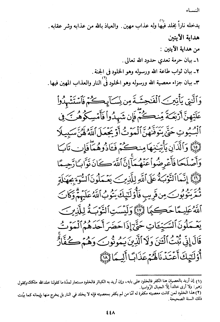 {وَاللاتِي يَأْتِينَ الْفَاحِشَةَ مِنْ نِسَائِكُمْ فَاسْتَشْهِدُوا عَلَيْهِنَّ أَرْبَعَةً مِنْكُمْ فَإِنْ شَهِدُوا فَأَمْسِكُوهُنَّ فِي الْبُيُوتِ حَتَّى يَتَوَفَّاهُنَّ الْمَوْتُ أَوْ يَجْعَلَ اللهُ لَهُنَّ سَبِيلاً (15) وَالَّذَانِ يَأْتِيَانِهَا مِنْكُمْ فَآذُوهُمَا فَإِنْ تَابَا وَأَصْلَحَا فَأَعْرِضُوا عَنْهُمَا إِنَّ اللهَ كَانَ تَوَّاباً رَحِيماً (16) إِنَّمَا التَّوْبَةُ عَلَى اللهِ لِلَّذِينَ يَعْمَلُونَ السُّوءَ بِجَهَالَةٍ ثُمَّ يَتُوبُونَ مِنْ قَرِيبٍ فَأُولَئِكَ يَتُوبُ اللهُ عَلَيْهِمْ وَكَانَ اللهُ عَلِيماً حَكِيماً (17) وَلَيْسَتِ التَّوْبَةُ لِلَّذِينَ يَعْمَلُونَ السَّيِّئَاتِ حَتَّى إِذَا حَضَرَ أَحَدَهُمُ الْمَوْتُ قَالَ إِنِّي تُبْتُ الآنَ وَلا الَّذِينَ يَمُوتُونَ وَهُمْ كُفَّارٌ أُولَئِكَ أَعْتَدْنَا لَهُمْ عَذَاباً أَلِيماً (18) }