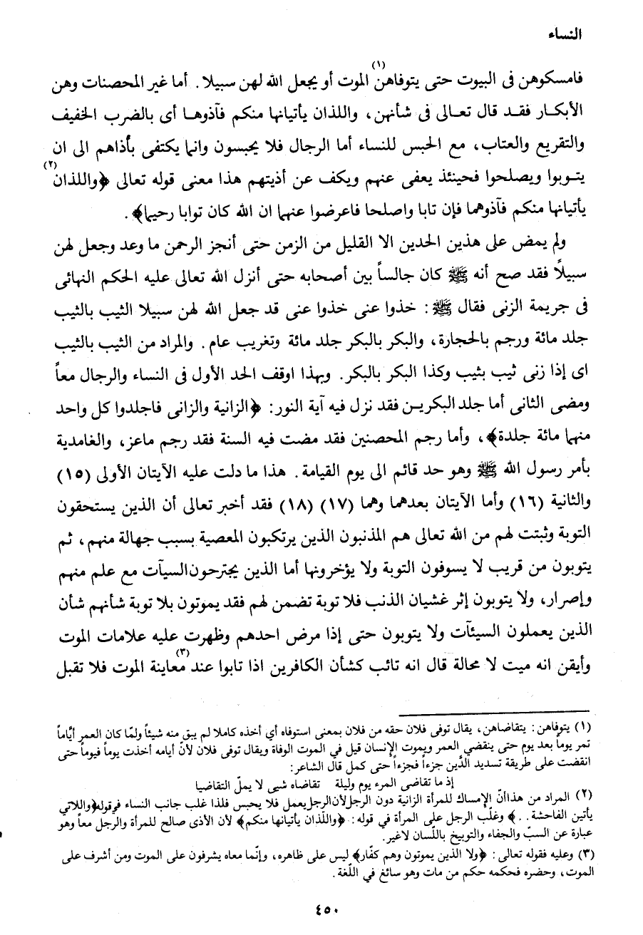 ولم يمض على هذين الحدين إلا القليل من الزمن حتى أنجز الرحمن ما وعد وجعل لهن سبيلاً، فقد صح أنه صَلَّى اللهُ عَلَيْهِ وَسَلَّمَ كان جالساً بين أصحابه حتى أنزل الله تعالى عليه الحكم النهائي في جريمة الزنا فقال صَلَّى اللهُ عَلَيْهِ وَسَلَّمَ: " خذوا عني، خذوا عني قد جعل الله لهن سبيلا الثيب بالثيب جلد مائة ورجم بالحجارة، والبكر بالبكر جلد مائة وتغريب عام". والمراد من الثيب بالثيب، أي: إذا ثيب بثيب، وكذا البكر بالبكر. وبهذا أوقف الحد الأول من النساء والرجال معاً ومضى الثاني، أما جلد البكرين فقد نزل فيه آية النور: {الزَّانِيَةُ وَالزَّانِي فَاجْلِدُوا كُلَّ وَاحِدٍ مِنْهُمَا مِائَةَ جَلْدَةٍ} ، وأما رجم المحصنين فقد مضت فيه السنة، فقد رجم ماعز، والغامدية بأمر رسول الله صَلَّى اللهُ عَلَيْهِ وَسَلَّمَ وهو حد قائم إلى يوم القيامة. هذا ما دلت عليه الآيتان الأولى (15) والثانية (16) ، وأما الآيتان بعدهما وهما (17) و (18) فقد أخبر تعالى أن الذين يستحقون التوبة وثبتت لهم من الله تعالى هم المذنبون الذين يرتكبون المعصية بسب جهالة منهم، ثم يتوبون من قريب لا يسوفون التوبة ولا يؤخرونها أما الذين يجترحون السيئات مع علم منهم وإصرار، ولا يتوبون إثر غشيان الذنب فلا توبة تضمن لهم فقد يموتون بلا توبة شأنهم شأن الذين يعملون السيئات ولا يتوبون حتى إذا مرض أحدهما وظهرت عليه علامات الموت وأيقن إنه ميت لا محالة قال إنه تائب كشأن الكافرين إذا تابوا عند3 معاينة الموت فلا تقبل