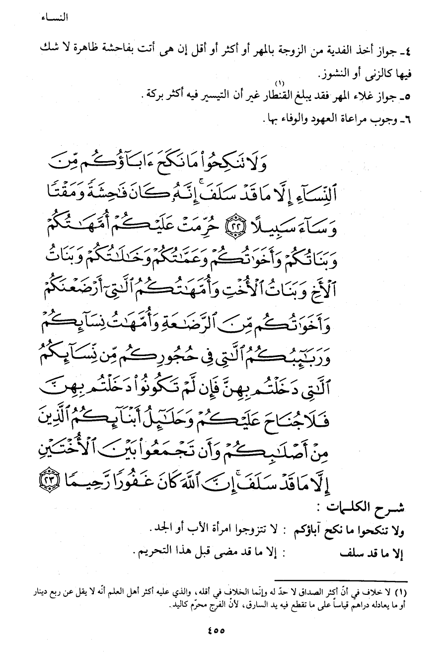 {وَلا تَنْكِحُوا مَا نَكَحَ آبَاؤُكُمْ مِنَ النِّسَاءِ إِلا مَا قَدْ سَلَفَ إِنَّهُ كَانَ فَاحِشَةً وَمَقْتاً وَسَاءَ سَبِيلاً (22) حُرِّمَتْ عَلَيْكُمْ أُمَّهَاتُكُمْ وَبَنَاتُكُمْ وَأَخَوَاتُكُمْ وَعَمَّاتُكُمْ وَخَالاتُكُمْ وَبَنَاتُ الأَخِ وَبَنَاتُ الأُخْتِ وَأُمَّهَاتُكُمُ اللاتِي أَرْضَعْنَكُمْ وَأَخَوَاتُكُمْ مِنَ الرَّضَاعَةِ وَأُمَّهَاتُ نِسَائِكُمْ وَرَبَائِبُكُمُ اللاتِي فِي حُجُورِكُمْ مِنْ نِسَائِكُمُ اللاتِي دَخَلْتُمْ بِهِنَّ فَإِنْ لَمْ تَكُونُوا دَخَلْتُمْ بِهِنَّ فَلا جُنَاحَ عَلَيْكُمْ وَحَلائِلُ أَبْنَائِكُمُ الَّذِينَ مِنْ أَصْلابِكُمْ وَأَنْ تَجْمَعُوا بَيْنَ الأُخْتَيْنِ إِلا مَا قَدْ سَلَفَ إِنَّ اللهَ كَانَ غَفُوراً رَحِيماً (23) }