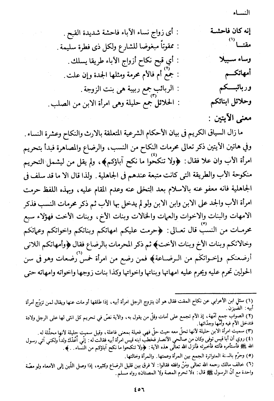 ما زال السياق الكريم في بيان الأحكام الشرعية المتعلقة بالإرث والنكاح وعشرة النساء. وفي هاتين الآيتين ذكر تعالى محرمات النكاح من النسب والرضاع والمصاهرة، فبدأ بتحريم امرأة الأب وإن علا فقال: {وَلا تَنْكِحُوا4 مَا نَكَحَ آبَاؤُكُمْ} ، ولم يقل من ليشمل التحريم منكوحة الأب والطريقة التي كانت متبعة عندهم في الجاهلية. ولذا قال إلا ما قد سلف في الجاهلية فإنه معفو عنه بالإسلام بعد التخلي عنه وعدم المقام عليه، وبهذه اللفظ حرمت امرأة الأب والجد على الابن وابن الابن ولو لم يدخل بها الأب، ثم ذكر محرمات النسب فذكر الأمهات والبنات والأخوات والعمات والخالات وبنات الأخ، وبنات الأخت فهؤلاء سبع محرمات من النسب5 قال تعالى: {حُرِّمَتْ عَلَيْكُمْ أُمَّهَاتُكُمْ وَبَنَاتُكُمْ وَأَخَوَاتُكُمْ وَعَمَّاتُكُمْ وَخَالاتُكُمْ وَبَنَاتُ الأَخِ وَبَنَاتُ الأُخْت} ، ثم ذكر المحرمات بالرضاع فقال: {وَأُمَّهَاتُكُمُ اللاتِي أَرْضَعْنَكُمْ وَأَخَوَاتُكُمْ مِنَ الرَّضَاعَةِ} فمن رضع من امرأة خمس6 رضعات وهو في سن الحولين، تحرم عليه ويحرم عليه أمهاتها وبناتها وأخواتها وكذا بنات زوجها وأمهاته حتى