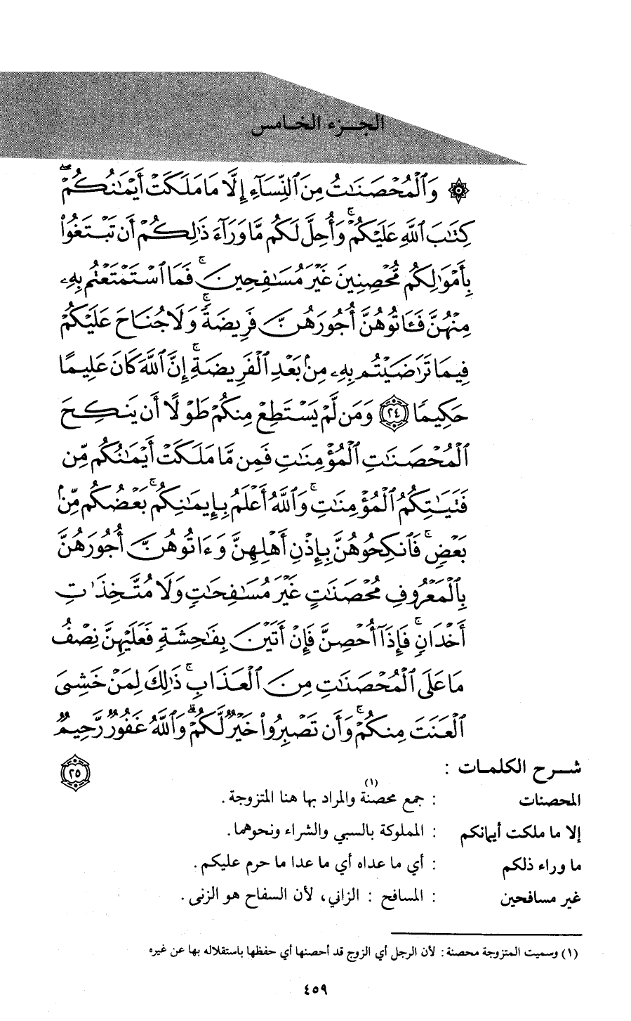 {وَالْمُحْصَنَاتُ مِنَ النِّسَاءِ إِلا مَا مَلَكَتْ أَيْمَانُكُمْ كِتَابَ اللهِ عَلَيْكُمْ وَأُحِلَّ لَكُمْ مَا وَرَاءَ ذَلِكُمْ أَنْ تَبْتَغُوا بِأَمْوَالِكُمْ مُحْصِنِينَ غَيْرَ مُسَافِحِينَ فَمَا اسْتَمْتَعْتُمْ بِهِ مِنْهُنَّ فَآتُوهُنَّ أُجُورَهُنَّ فَرِيضَةً وَلا جُنَاحَ عَلَيْكُمْ فِيمَا تَرَاضَيْتُمْ بِهِ مِنْ بَعْدِ الْفَرِيضَةِ إِنَّ اللهَ كَانَ عَلِيماً حَكِيماً (24) وَمَنْ لَمْ يَسْتَطِعْ مِنْكُمْ طَوْلاً أَنْ يَنْكِحَ الْمُحْصَنَاتِ الْمُؤْمِنَاتِ فَمِنْ مَا مَلَكَتْ أَيْمَانُكُمْ مِنْ فَتَيَاتِكُمُ الْمُؤْمِنَاتِ وَاللهُ أَعْلَمُ بِإِيمَانِكُمْ بَعْضُكُمْ مِنْ بَعْضٍ فَانْكِحُوهُنَّ بِإِذْنِ أَهْلِهِنَّ وَآتُوهُنَّ أُجُورَهُنَّ بِالْمَعْرُوفِ مُحْصَنَاتٍ غَيْرَ مُسَافِحَاتٍ وَلا مُتَّخِذَاتِ أَخْدَانٍ فَإِذَا أُحْصِنَّ فَإِنْ أَتَيْنَ بِفَاحِشَةٍ فَعَلَيْهِنَّ نِصْفُ مَا عَلَى الْمُحْصَنَاتِ مِنَ الْعَذَابِ ذَلِكَ لِمَنْ خَشِيَ الْعَنَتَ مِنْكُمْ وَأَنْ تَصْبِرُوا خَيْرٌ لَكُمْ وَاللهُ غَفُورٌ رَحِيمٌ (25) }