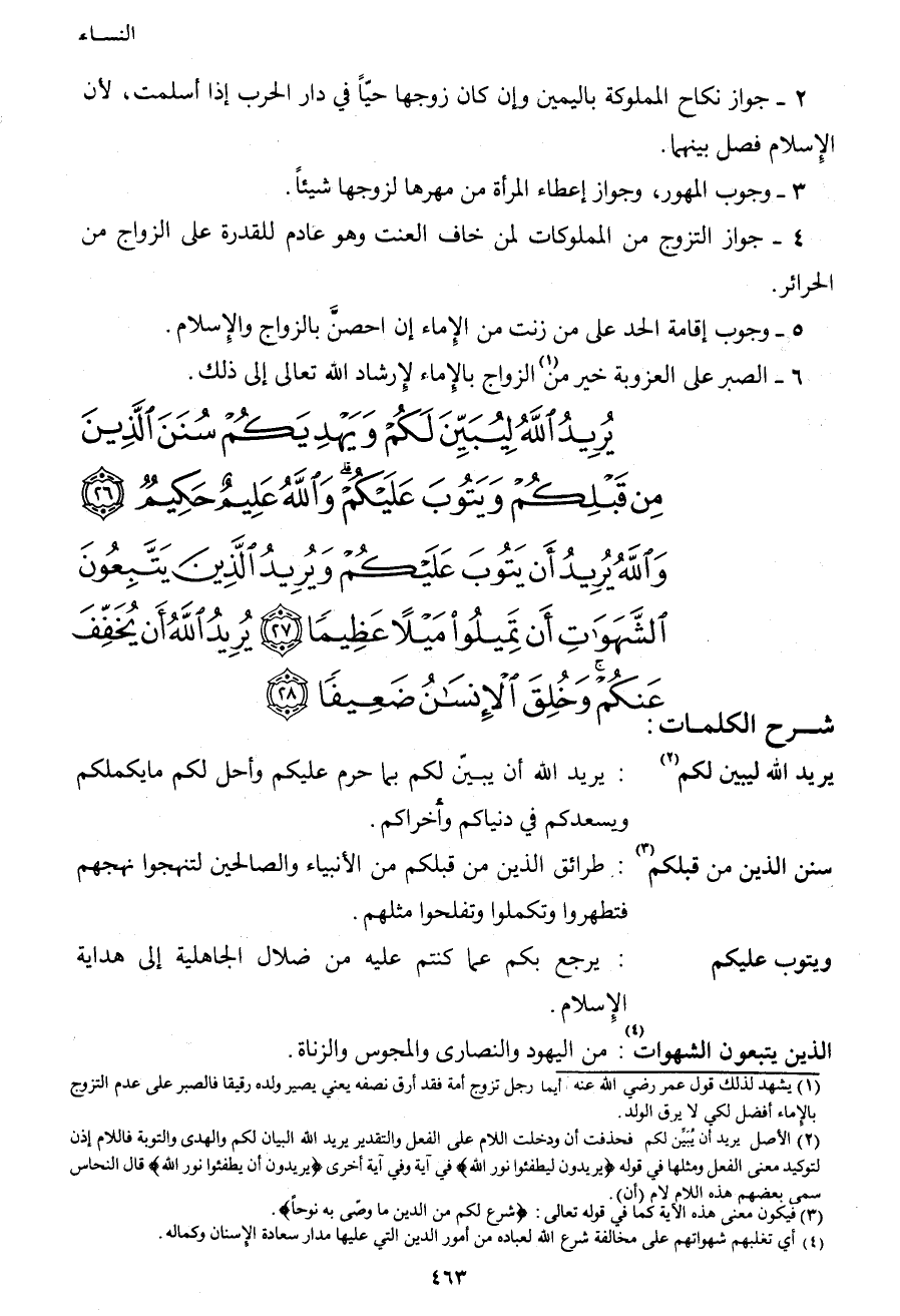 {يُرِيدُ اللهُ لِيُبَيِّنَ لَكُمْ وَيَهْدِيَكُمْ سُنَنَ الَّذِينَ مِنْ قَبْلِكُمْ وَيَتُوبَ عَلَيْكُمْ وَاللهُ عَلِيمٌ حَكِيمٌ (26) وَاللهُ يُرِيدُ أَنْ يَتُوبَ عَلَيْكُمْ وَيُرِيدُ الَّذِينَ يَتَّبِعُونَ الشَّهَوَاتِ أَنْ تَمِيلُوا مَيْلاً عَظِيماً (27) يُرِيدُ اللهُ أَنْ يُخَفِّفَ عَنْكُمْ وَخُلِقَ الإِنْسَانُ ضَعِيفاً (28) }