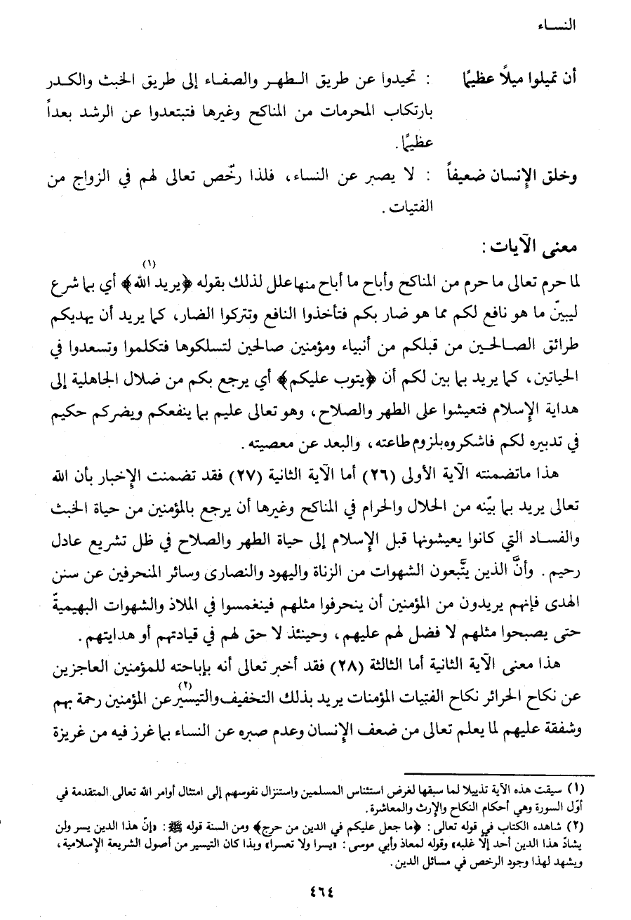 هذا ما تضمنته الآية الأولى (26) ، أما الآية الثانية (27) فقد تضمنت الإخبار بأن الله تعالى يريد بما بينه من الحلال والحرام في المناكح وغيرها أن يرجع بالمؤمنين من حياة الخبث والفساد التي كانوا يعيشونها قبل الإسلام إلى حياة الطهر والصلاح في ظل تشريع عادل رحيم. وأن الذين يتبعون الشهوات من الزناة والنصارى وسائر المنحرفين عن سنن الهدى فإنهم يريدون من المؤمنين أن ينحرفوا مثلهم فينغمسوا في الملاذ والشهوات البهيمية حتى يصبحوا مثلهم لا فضل لهم عليهم، وحينئذ لا حق لهم في قيادتهم أو هدايتهم.